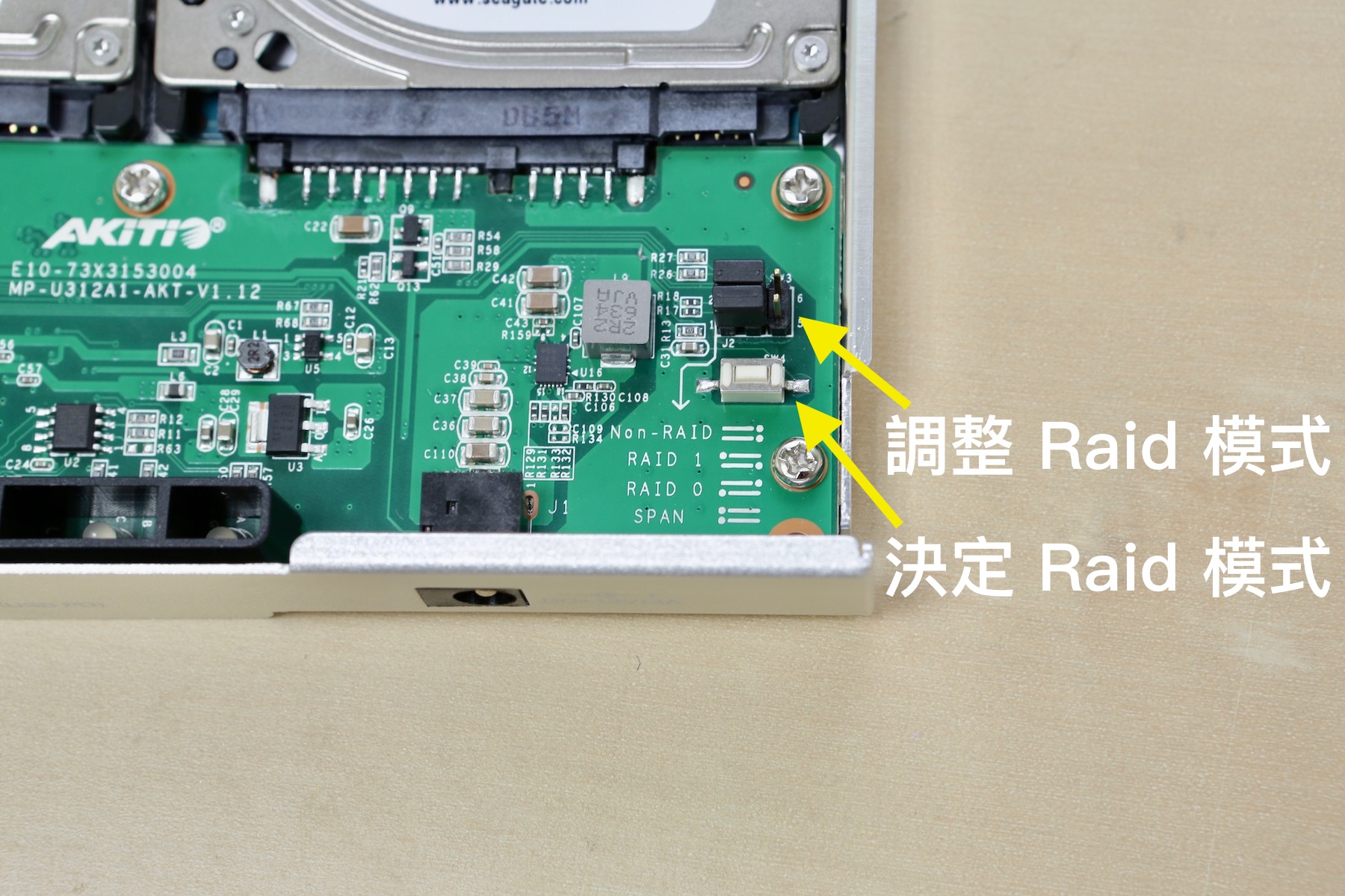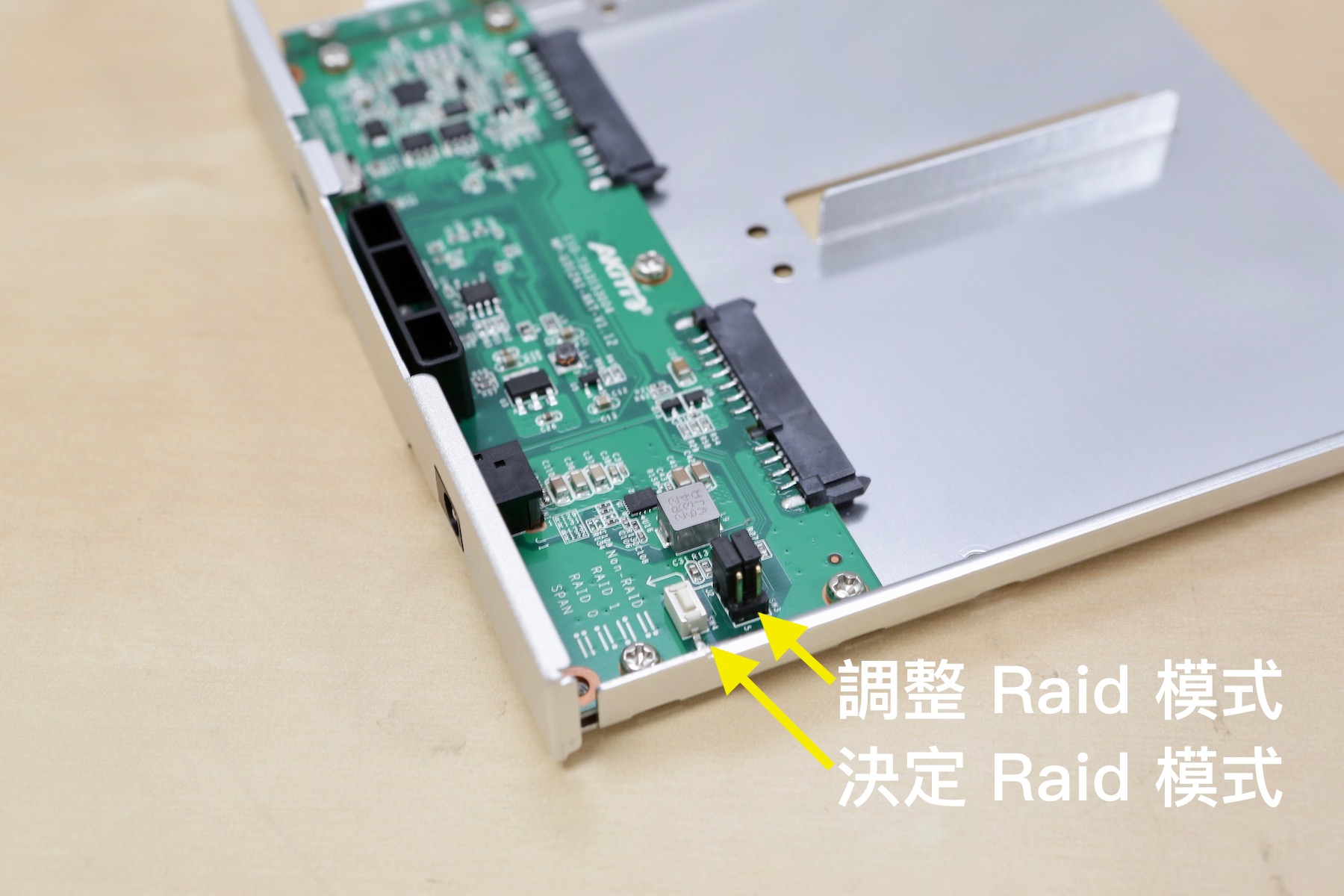 ▼ 鎖好之後先不要裝上,我們先來調整想要的 Raid 模式,這裡有可以支援四種模式,預設的就是獨立分開兩顆硬碟。或是注重安全備份的 Raid 1,重視速度的 Raid 0,或是只是想單純變成一顆大硬碟的 SPAN。要調整模式,就是把箭頭所指的那兩個黑色跳 pin 拔起來,按照你想要的方式(電路板下面有指示)插上。