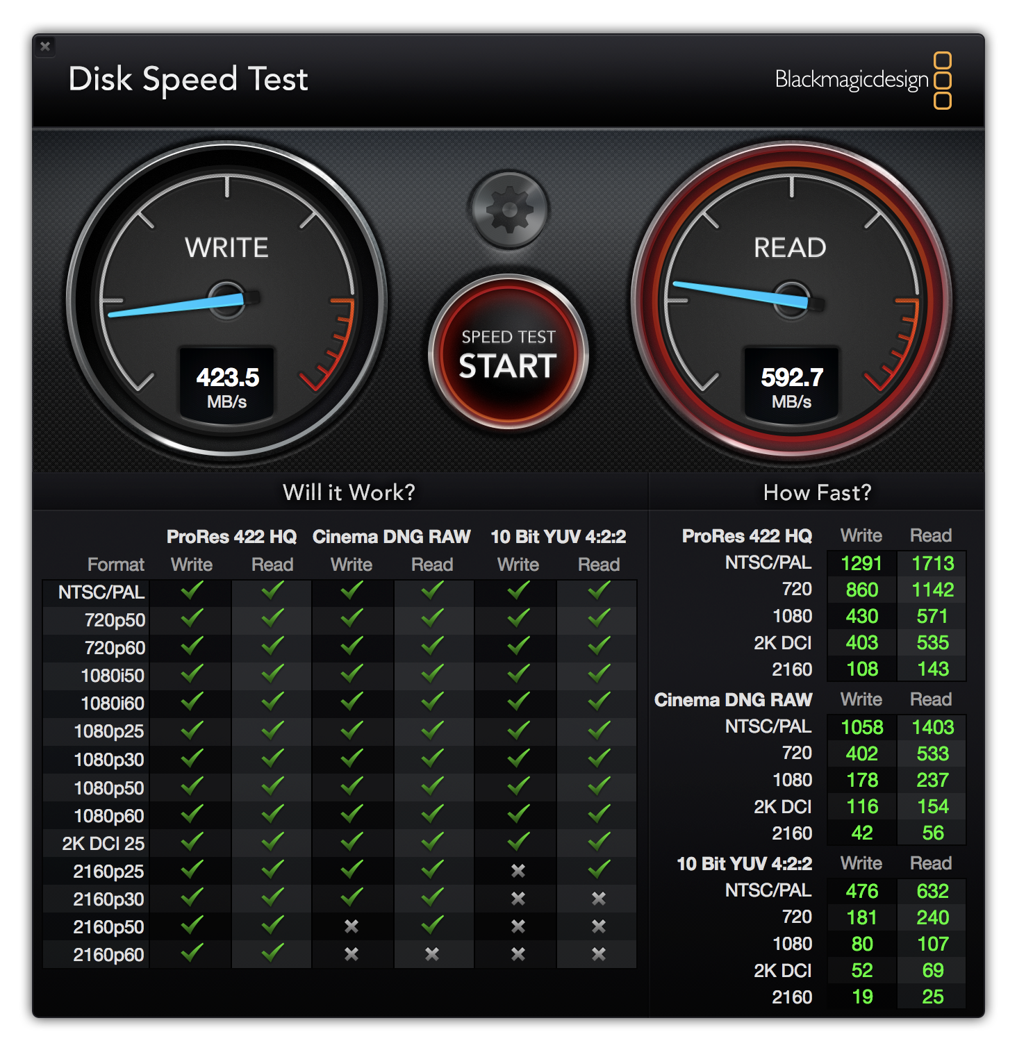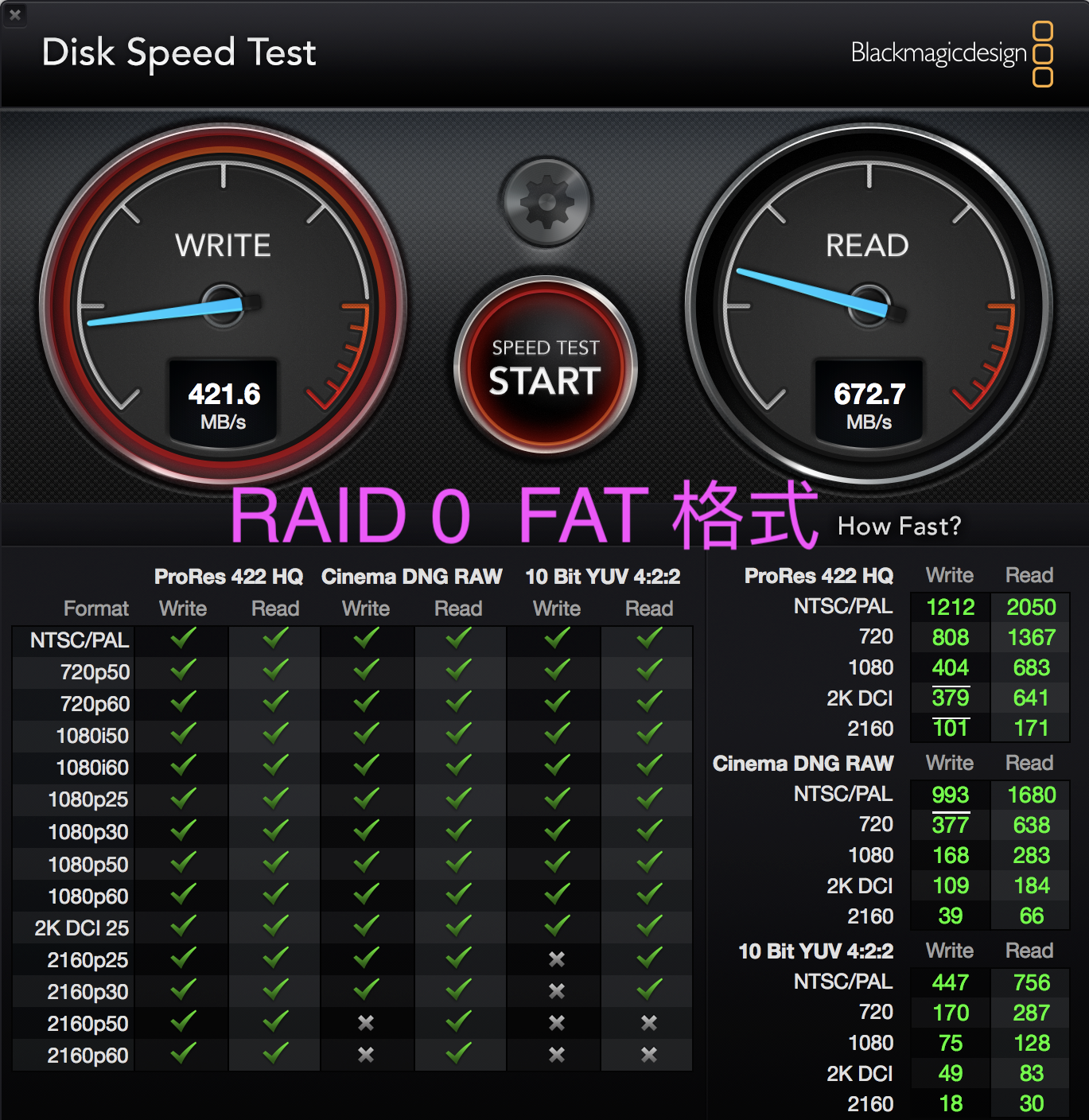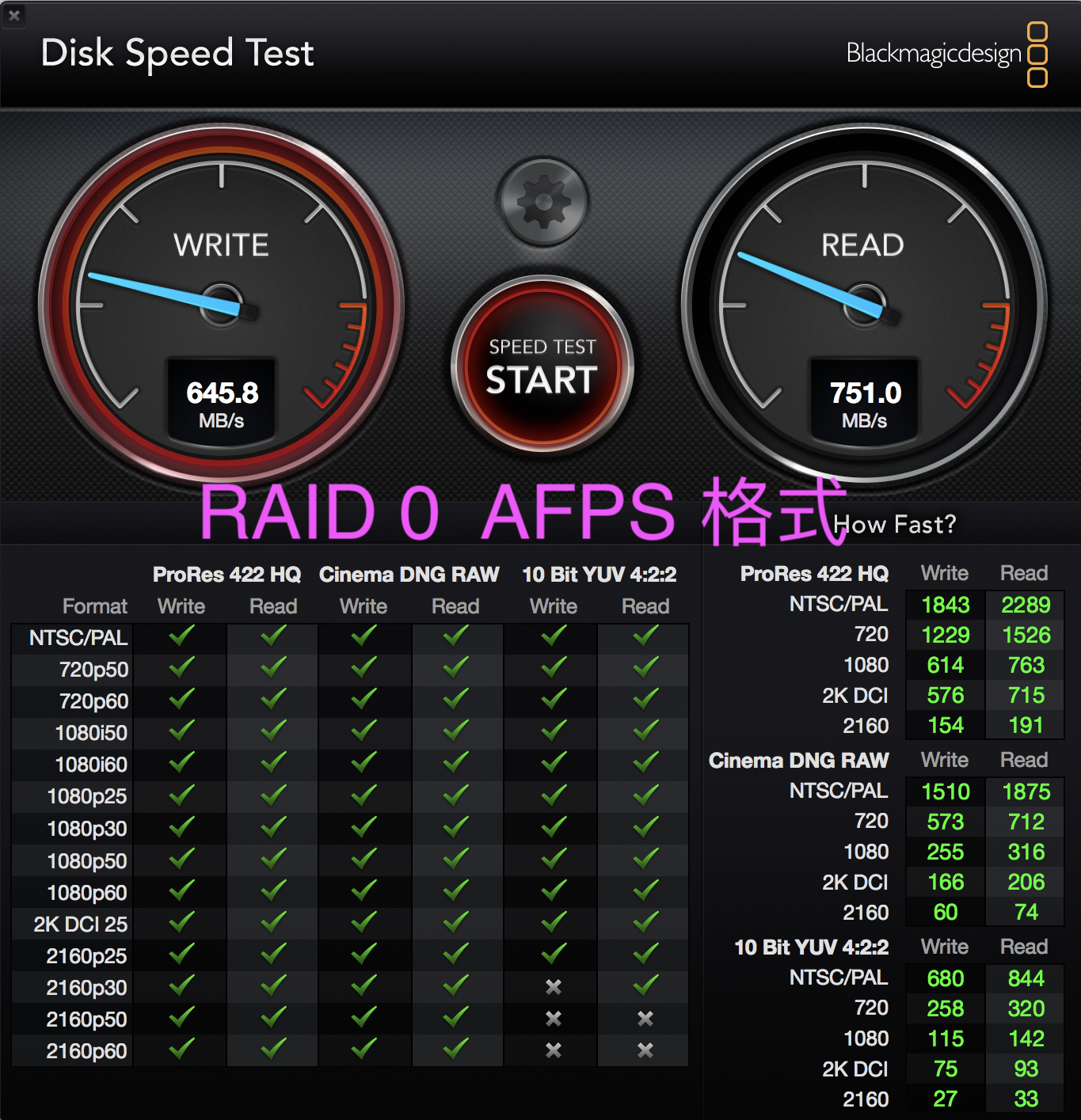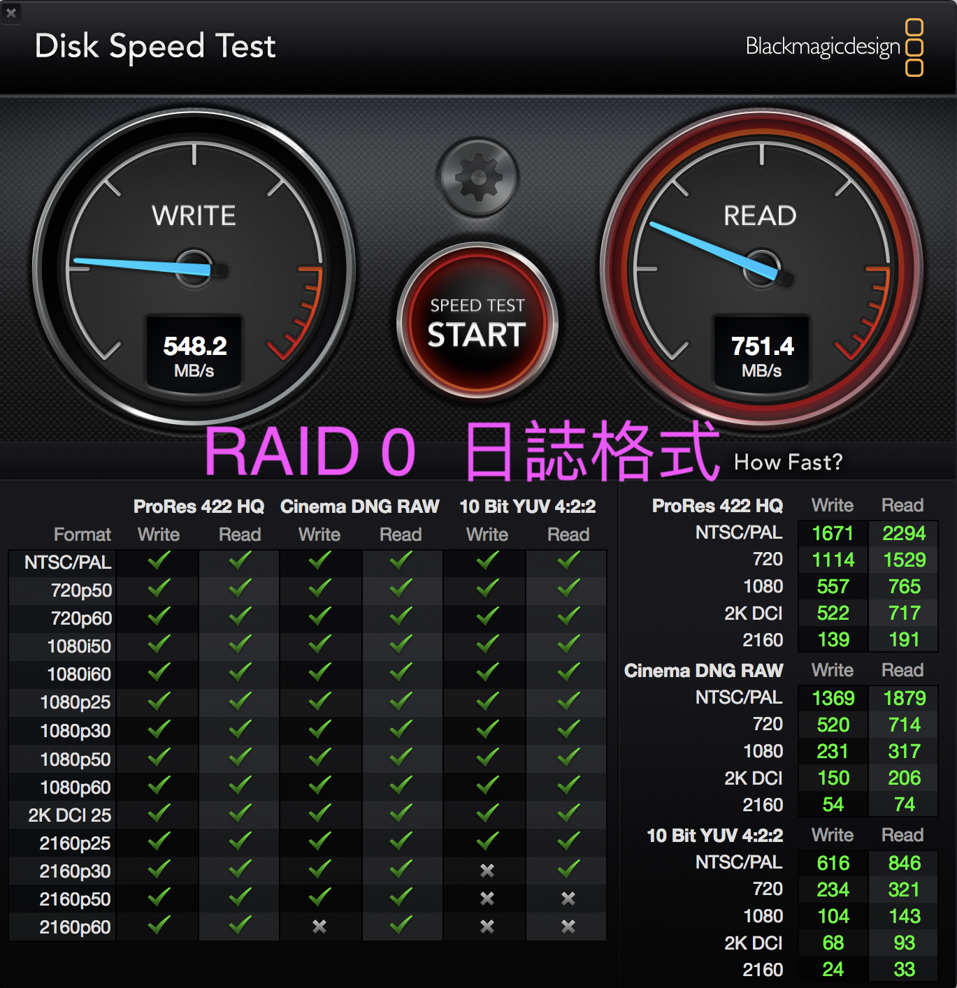 ▼ 這次的 SSD 速度不錯,在兩顆做 RAID0 的情況下,最快可以到讀取 750 MB/s 的速度,但我們也觀察到,不同格式下的速度真的是有落差。