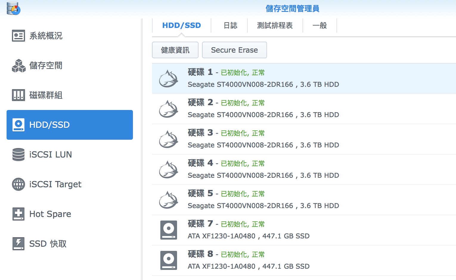 ▼ 裝好之後就可以在儲存空間那邊看到我們裝入的 5 顆 NAS 狼,還有兩顆 SSD,我硬碟選用 NAS 狼就是為了出現那顆狼頭。