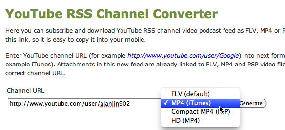 利用iTunes的Podcast功能與這個網站RSSHandler,就可以讓YouTube的影片源源不絕地下載到iTunes中,在同步到iPod或iPhone中,非常方便。特別是對於沒有使用無限費率、沒有網路的朋友,每天都有最新的影片可以看。