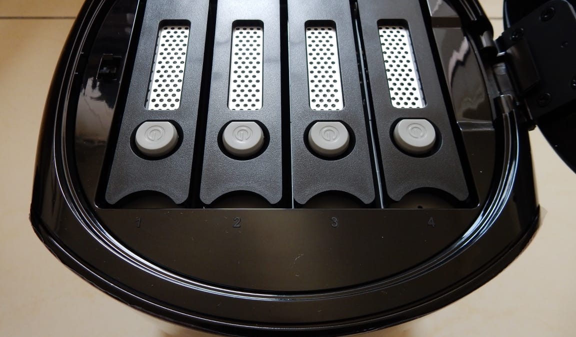 四顆 HDD 都裝好後,就可以沿著插槽依序裝回,然後各自按下擋板,聽到喀擦一聲就表示裝好了。