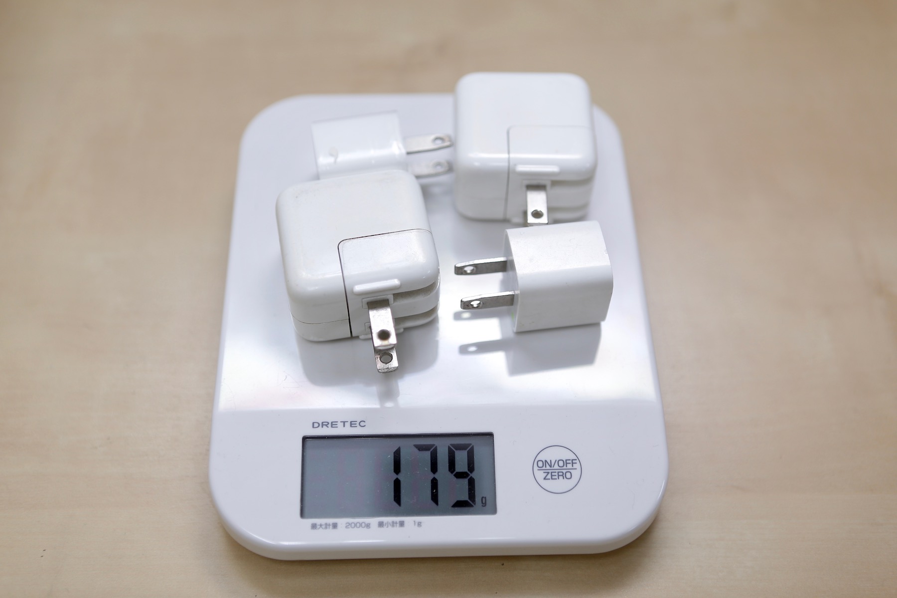 ▼ 剛剛我們說可以一次充兩台 iPad 加兩台 iPhone,所以我們把這四個充電頭一起秤,答案是 180 克。