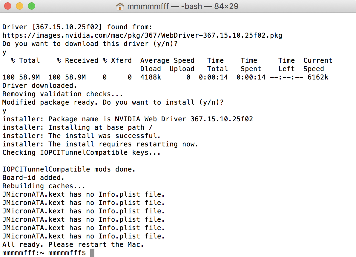 ▼ 過程中如果有 (y/n)的選項,就是 y 按下去就對了。他會下載 nvidia 的驅動,會花一點時間,最後看到他叫你重新開機就是完成了。就放心關機吧。