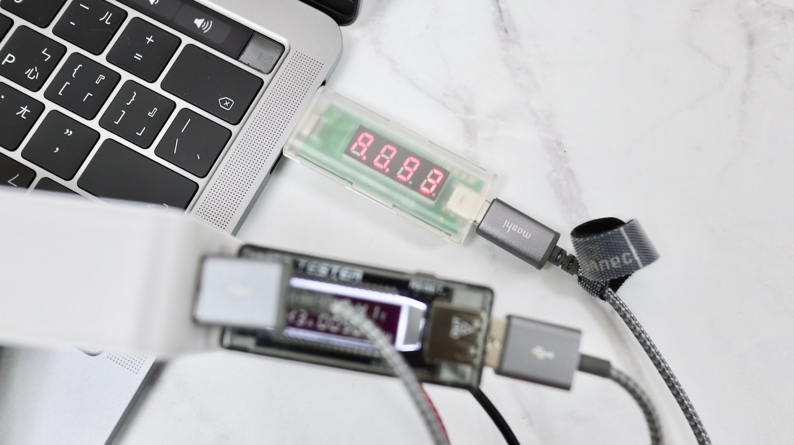 ▼ 比方說如果單接已經有電的 MacBook Pro,一開始可以得到比較高的電流,不過只要同時接上快沒電的 iPad,可以看到 MacBook 的電流就被分配走,只剩下 1A 上下。
