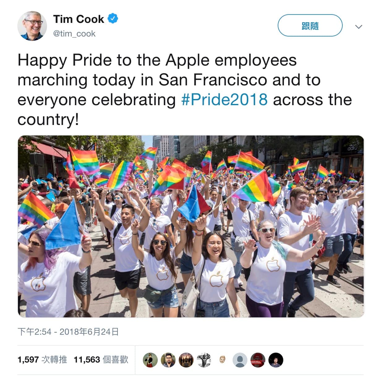 而眾所皆知,Apple 一直都是全力支持同志權益的企業,作為蘋果的 CEO,Tim Cook 除了本身已經出櫃很多年。去年的美國同志遊行,Tim Cook 更是在自己的推特上大方支持。