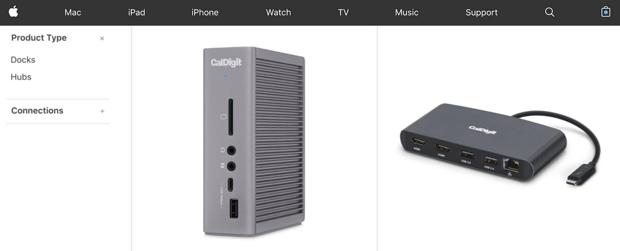 ▼ 怎麼樣證明是一線廠商?能在 Apple Online Store 上販售,我想列為一線廠商應該是沒有爭議了。不過 Apple 官網只有賣短線的版本,我們則是兩個版本都有賣。圖中右邊的雙4K@60螢幕轉接器我們也有,還比 Apple 官網便宜 https://shop.macuknow.com/product/3503-caldigittb3dphdmi/