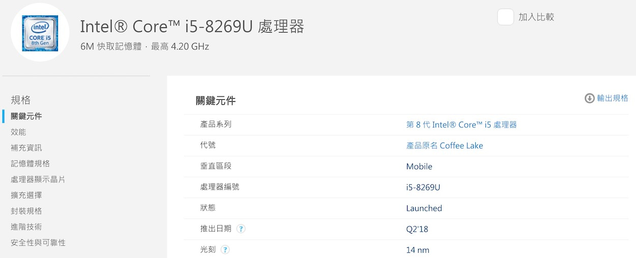 ▼ 總之,我們可以先查一下這次是用哪一個 CPU 型號,然後就可以推算他的效能。不過蘋果這次也是使用了官網找不到的特製款,從 Intel 官網比對以及國外媒體的猜測來看,這次應該就是使用了 8265U 這顆相同等級的處理器,然後是蘋果特製款。(他們官網找不到相同條件的,所以只能先拿最接近的 8265U 來比)