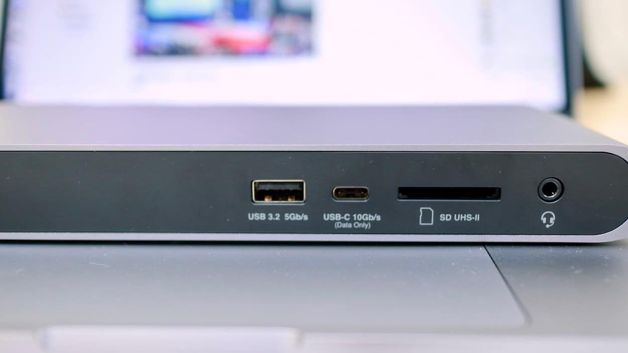 ▼ 所以如果你插上的是 USB-C 的電腦,正面可以擴充一個 5Gbps 跟一個 10Gbps(純資料傳輸無法拿去串影像) ,不過由於 MacBook 12″ 的 USB-C 只有 5Gbps 所以這邊無法向上變成 10Gbps 。