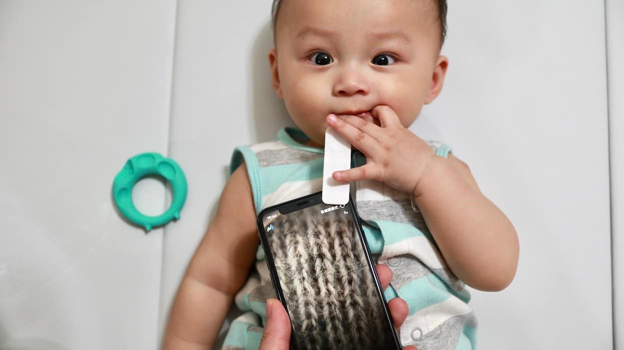 ▼ 所以光是低倍鏡樂趣就超級多的。裝上去的瞬間我已經顧不上要仔細開箱什麼的,到處家裡看到什麼就把手機貼上去看一下。可以看到我兒子的衣服原來纖維可以放大這麼大。