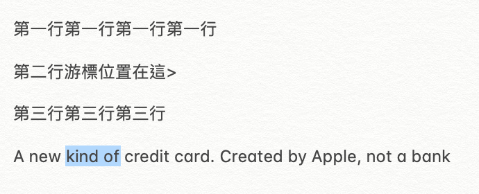 ▼ 另外,如果是英文,一個一個字母移動太累人了,可以利用 option 加左右,就可以依次移動一個單字,搭配 shift 也可以選取這些範圍。 (這點感謝 Gary 補充)