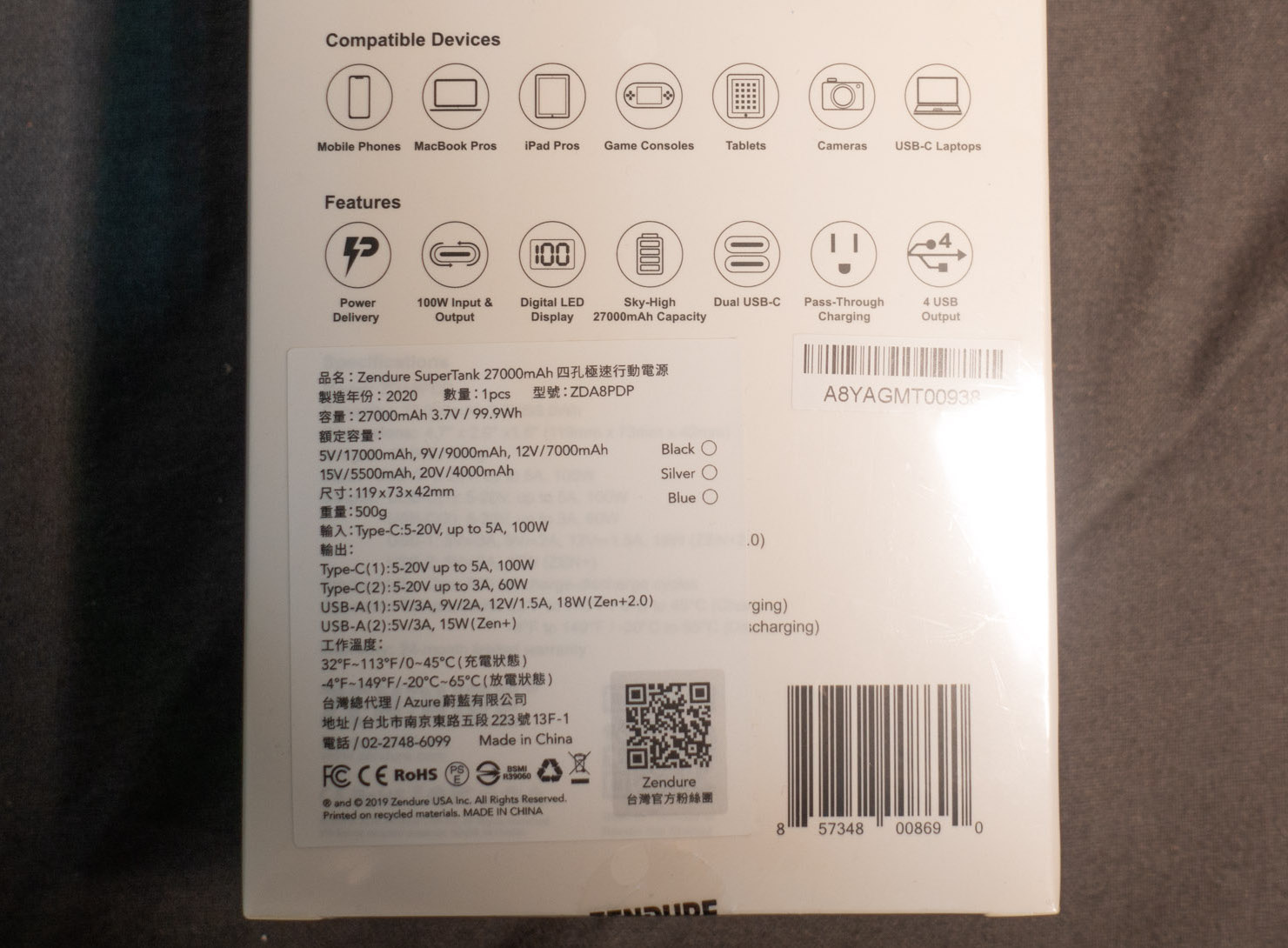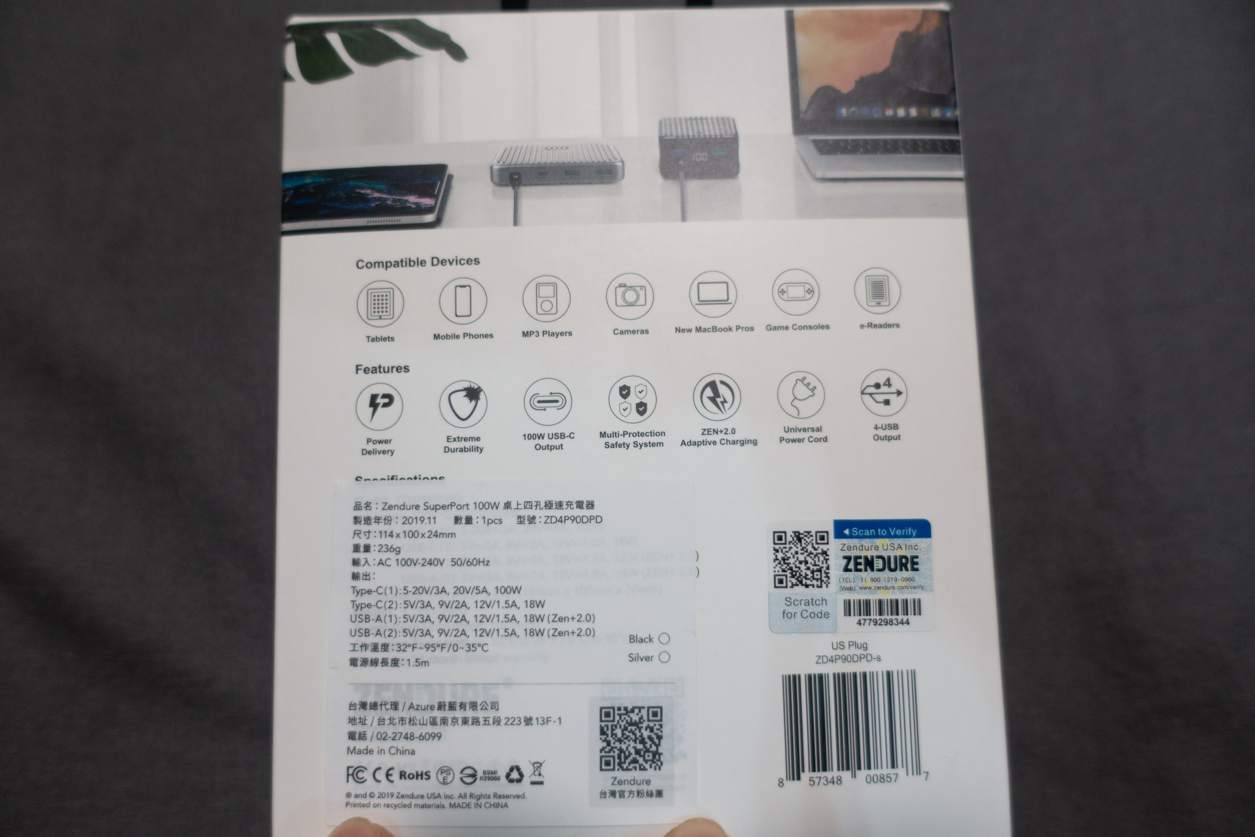 ▼ Zendure 系列產品都帶有防偽標籤,本身有兩年保固。輸入支援 100~240V 全球電壓,國外使用沒什麼問題。SuperPort 顏色有黑色與銀色款式。
