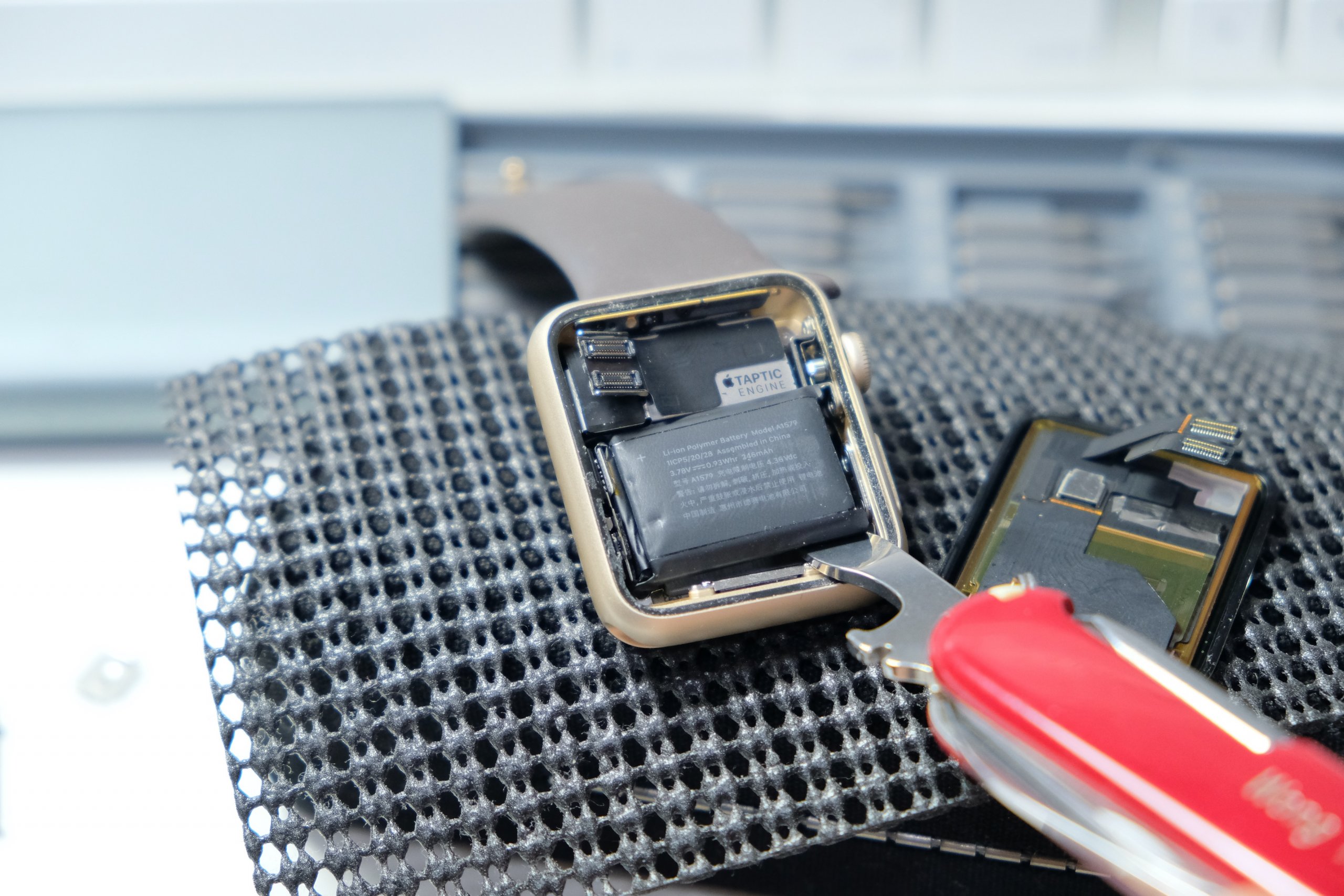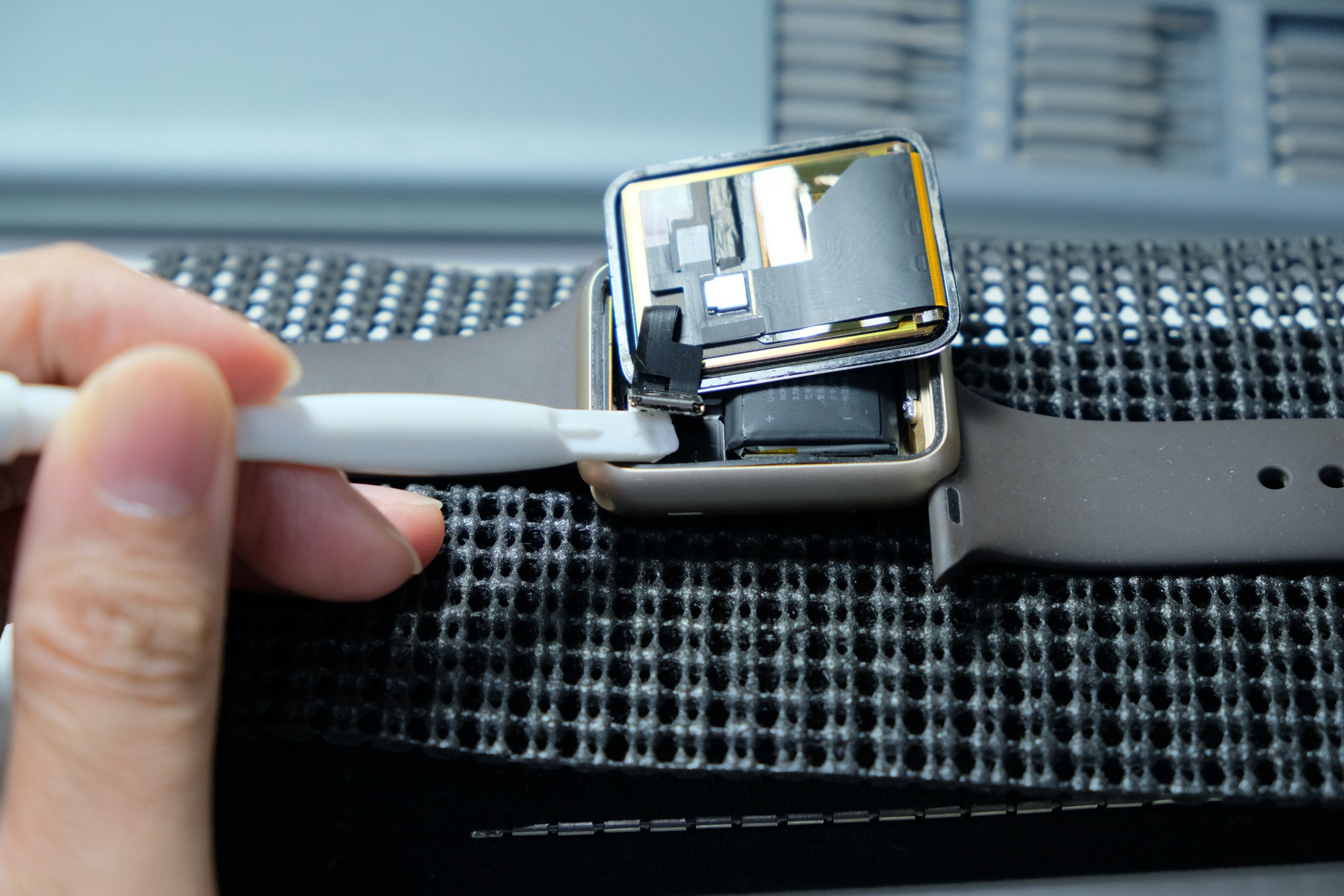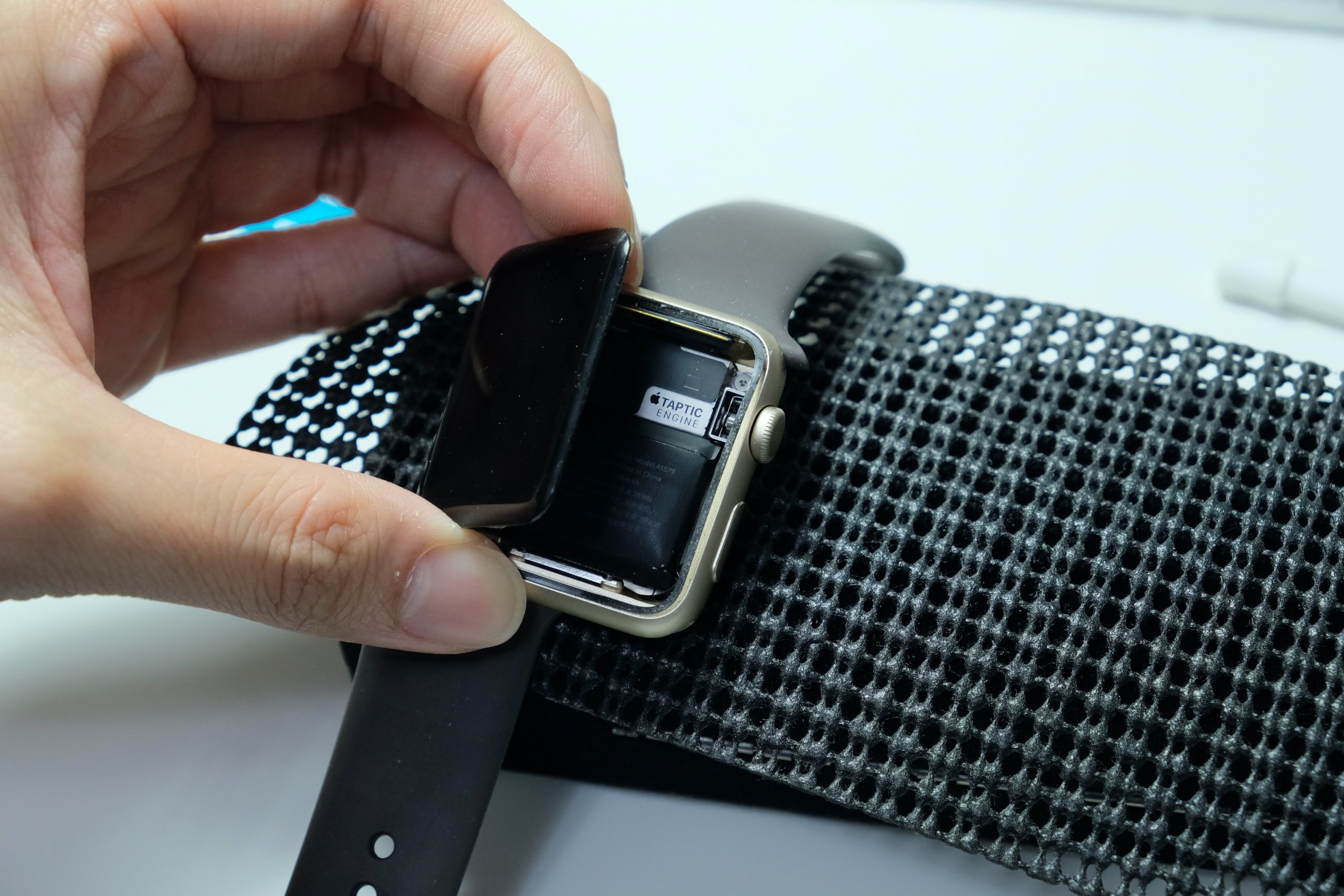 接著準備進行拆解 Apple Watch 的第二個難關,在各個拆解影片裡面都花了相當的篇幅與時間在跟這塊金屬板搏鬥…