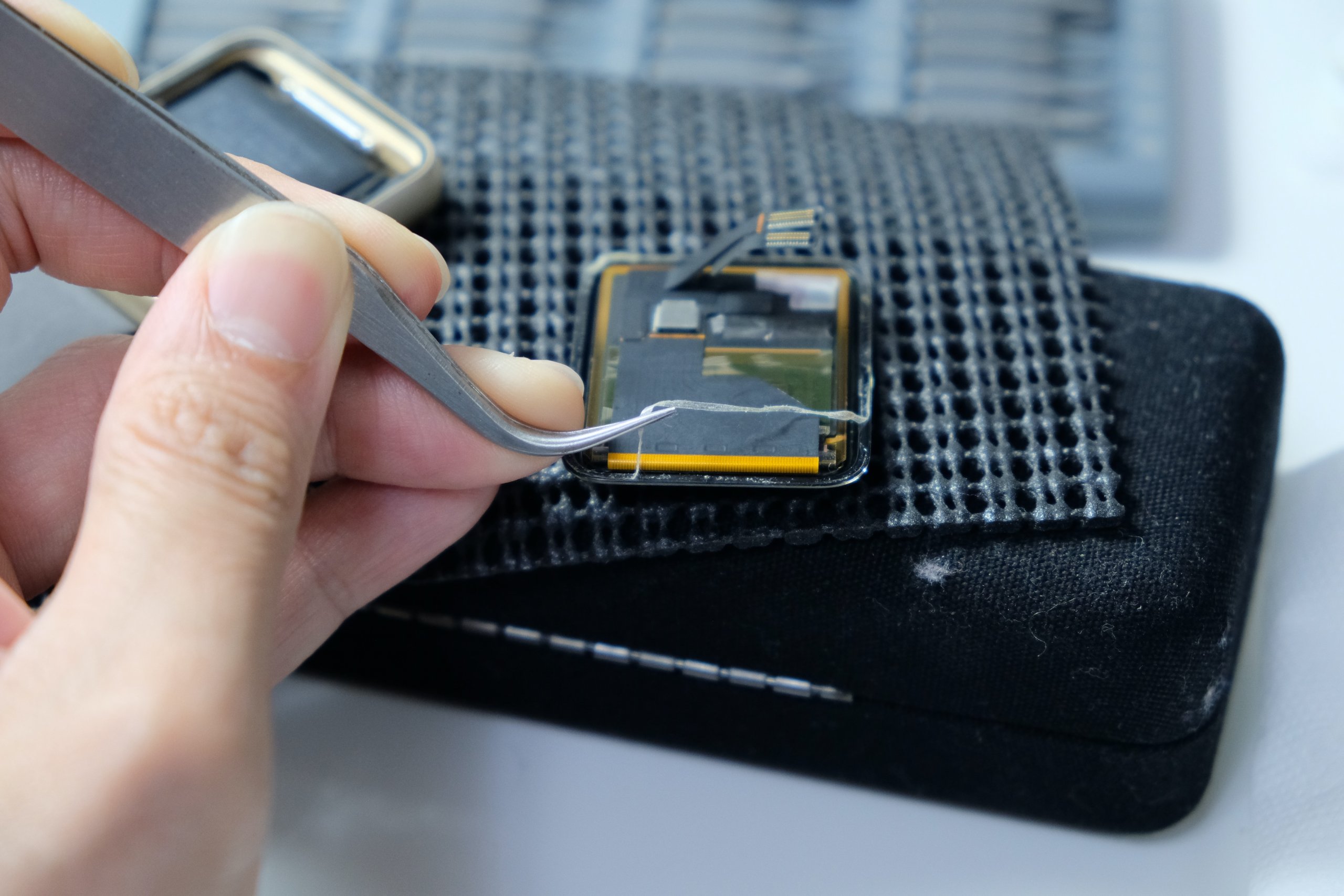 接著就是一連串非常細緻的手工,將 Force Touch 排線、機殼、螢幕的邊緣都貼上雙面膠