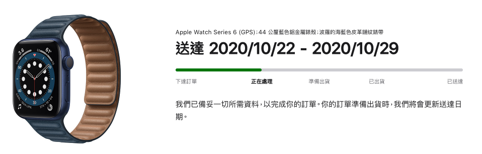 今年 Apple Watch Series 6 的買氣實在嚇人,小編購買了 44 mm 藍色鋁金屬搭配藍色皮革錶帶,一等就要一個多月。