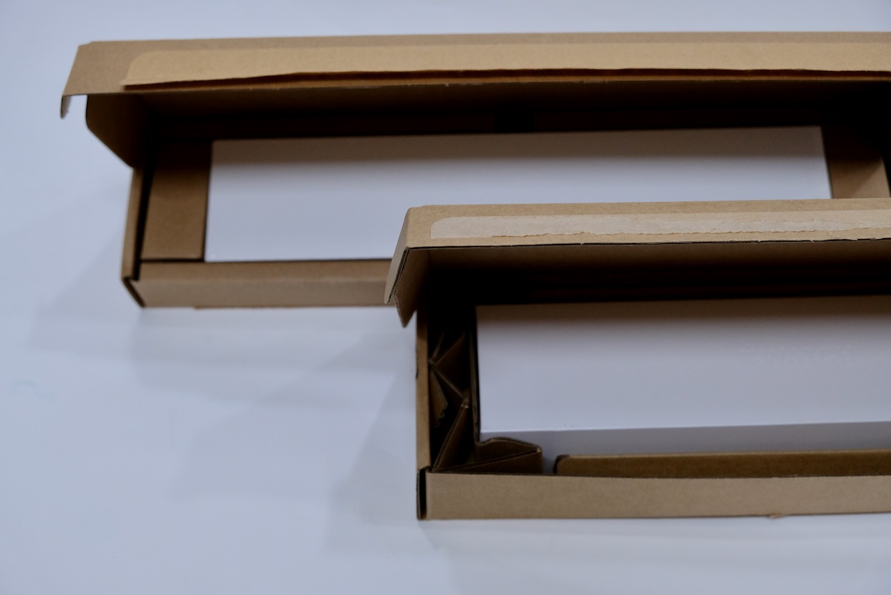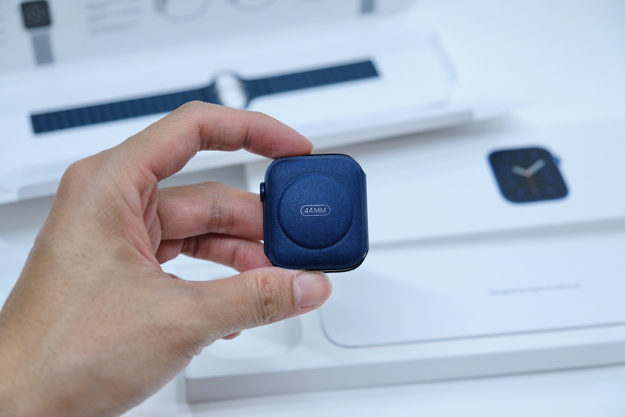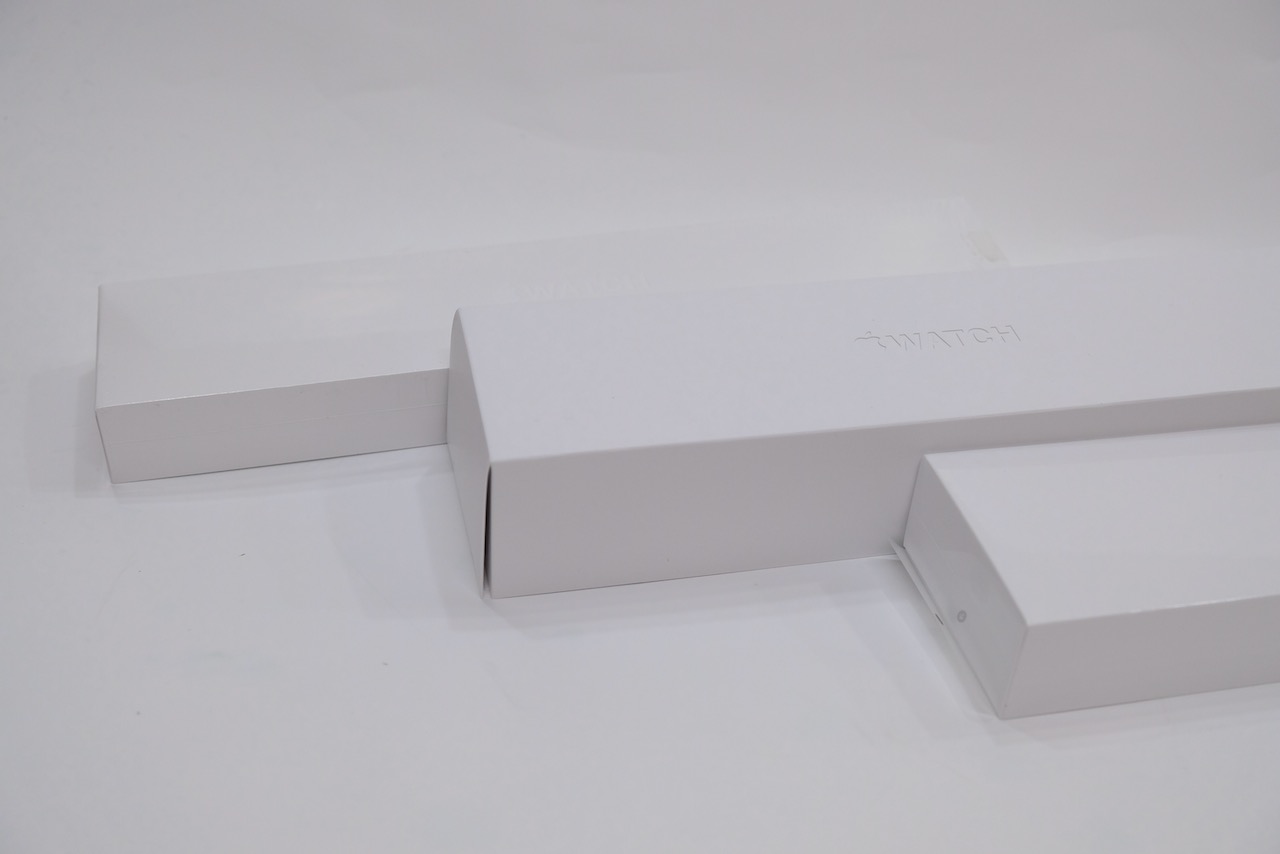 這邊使用了小編古早的 Apple Watch Series 1 完整包裝來比較,上面是 S1,下面是 S6,基本上該有的緩衝設計一點都沒少,但肯定最大程度地減少了原物料使用,同時達到環保的目標