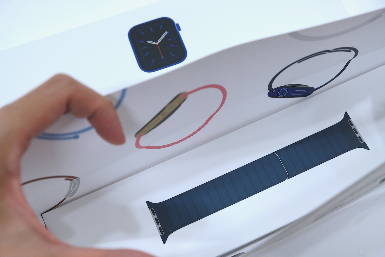本次 Apple Watch Series 6 的包裝外盒,這次蘋果官網開放使用 Apple Watch Studio 服務,也就是能夠在官網頁面上直接客製化錶殼與錶帶的搭配,可以直接買到喜歡的錶帶,也能避免浪費一組可能重複的運動型錶帶。