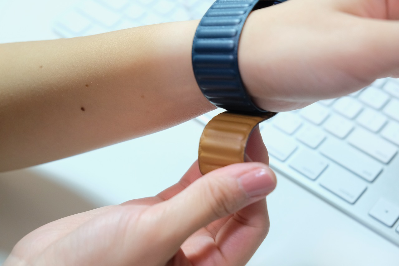 而反過來,由上方錶帶在上,試圖吸附下方錶帶,會發現吸力非常弱,到幾乎不能使用的地步,讓你自然而然就會按照蘋果設計的方式來扣上錶帶