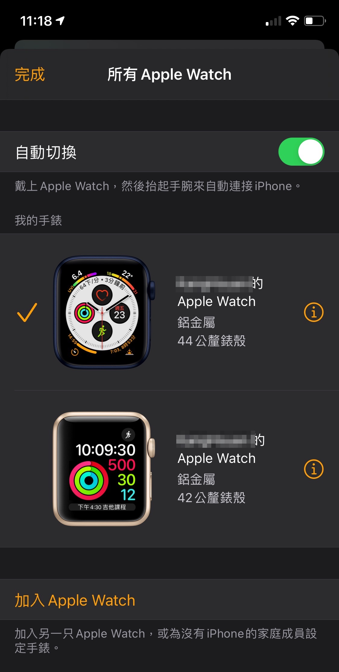 配對完成後,可以在 iPhone 的裝置裡同時看到兩台 Apple Watch