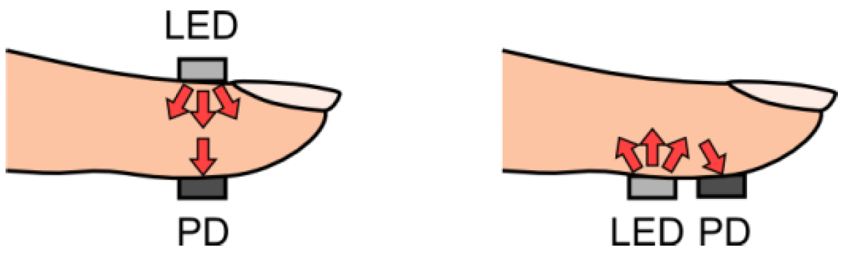 血氧濃度偵測主要有兩種模式,一種是在醫療院所常見,多用在肢體末梢(如手指頭)的穿透式(transmittance oximetry)(圖左),另一種則是包含Apple Watch,大多數穿戴式裝備所採用的光學反射式(reflectance oximetry)(圖右)[1]。