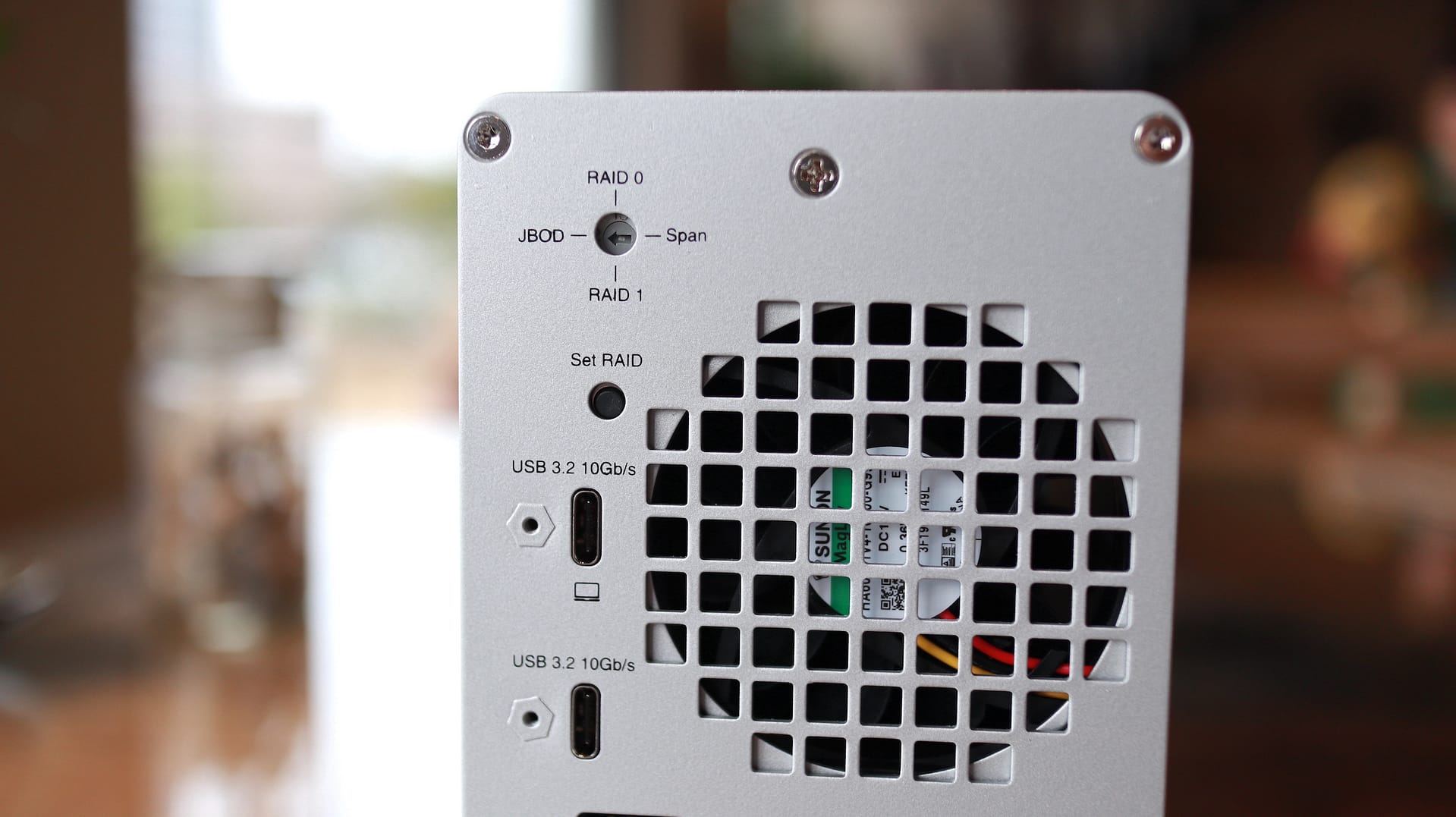 ▼ 背面的上半部,有著 Raid 的模式設定,要用十字起子轉一下,然後按下 「Set RAID」。兩個 10Gb’s 的 USB-C(一個固定是接電腦用),以及固定風扇(不可關)。