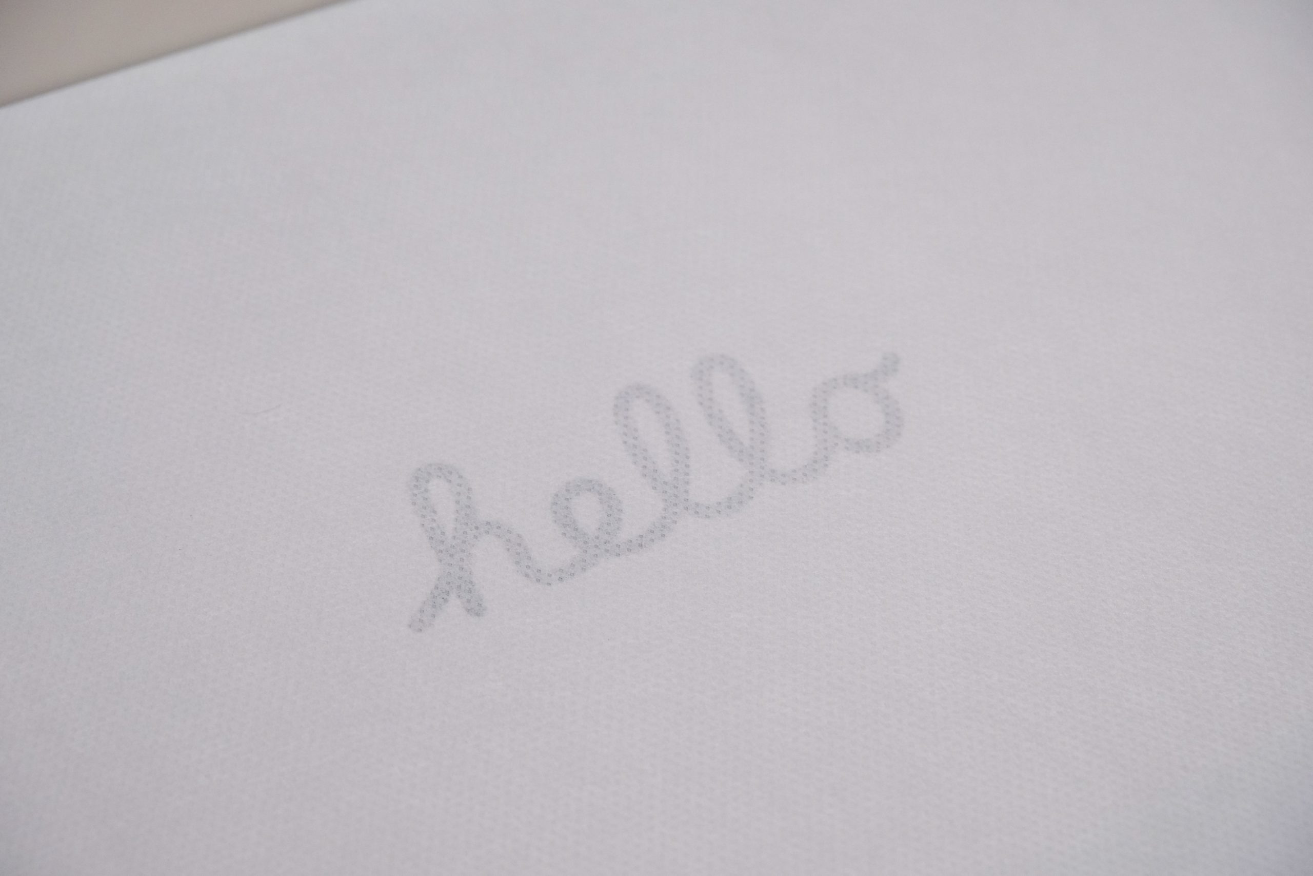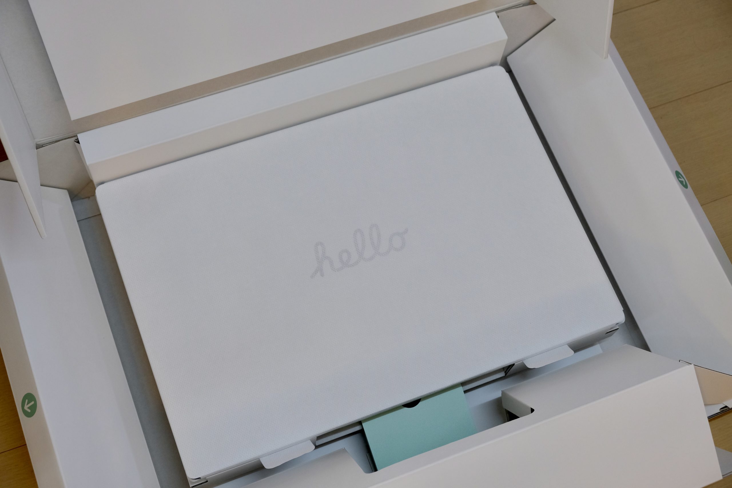 ▼ 第一層蓋子打開後,馬上映入眼簾的是 M1 iMac 24吋的大螢幕,以及上面保護貼的印刷字樣“hello”