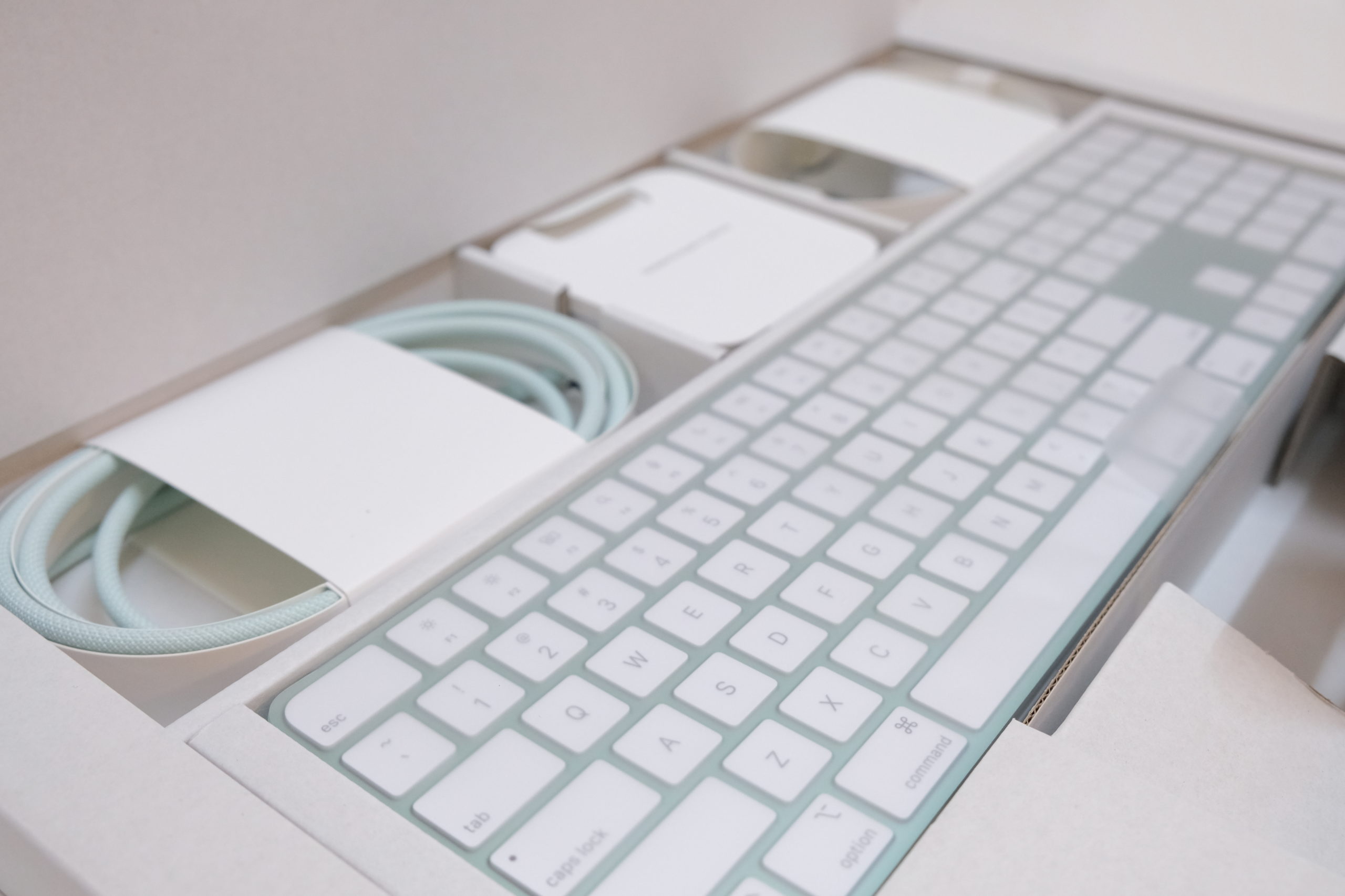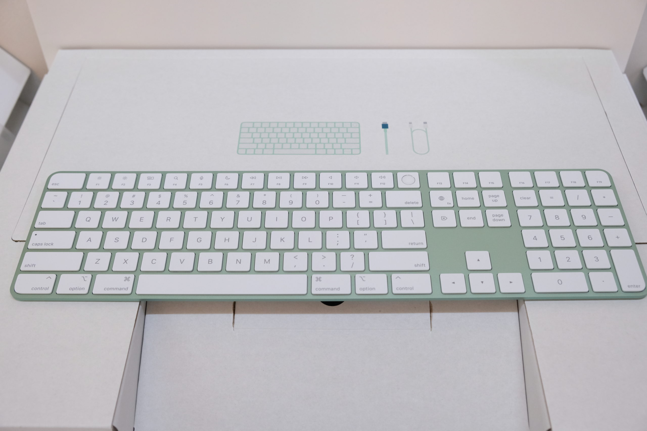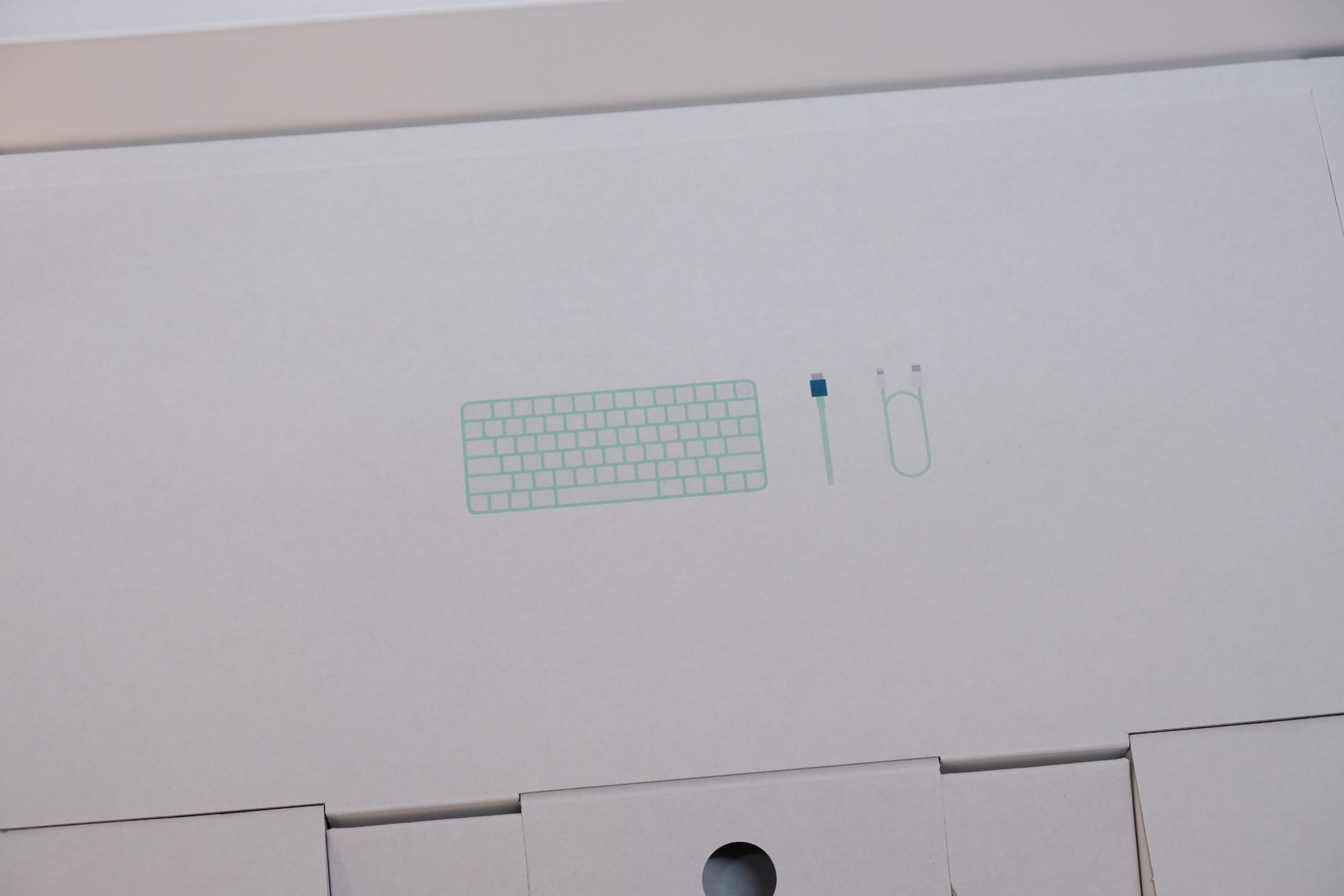 除此之外,這次 M1 iMac 最令人津津樂道的,就是搭配的彩色配件,同色調的電源線、lightning to USB-C充電線、鍵盤、滑鼠、觸控板,連蘋果貼紙都首次出現彩色版本,真的是逼死那些包色收藏家了,尤其是兩條電線,都是採用編織的技術來包裹線材外表,非常賞心悅目。特別要提的,是這次 M1 iMac 的包裝設計非常優秀,完全採用了環保材料,跟去年 27 吋 iMac 與更早的機種那整盒的保麗龍比起來,可以看得出蘋果在全環保包裝材料的承諾中所下足的心血,沒有保麗龍,也一樣能完美地保護盒子裡的內容物,而且整線的技術,配件的位置安排,都非常具有巧思,蘋果在開箱體驗中不斷突破自我,很難不讓粉絲們聲聲讚嘆。
