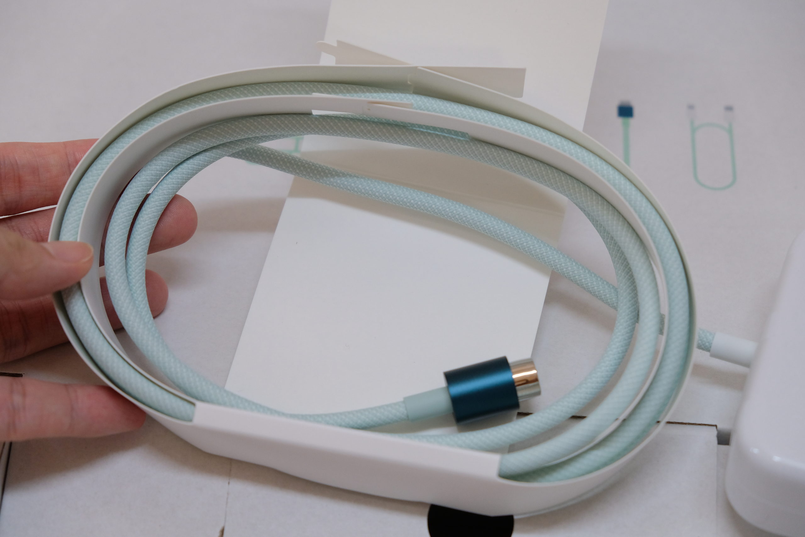▼ 同樣配色的電源線跟變壓器,這裡可以看到蘋果神乎其技的綑線執念,我怎麼看都看不出來這電源線是怎麼綑的,而且一旦打開,就完全再也繞不回去。