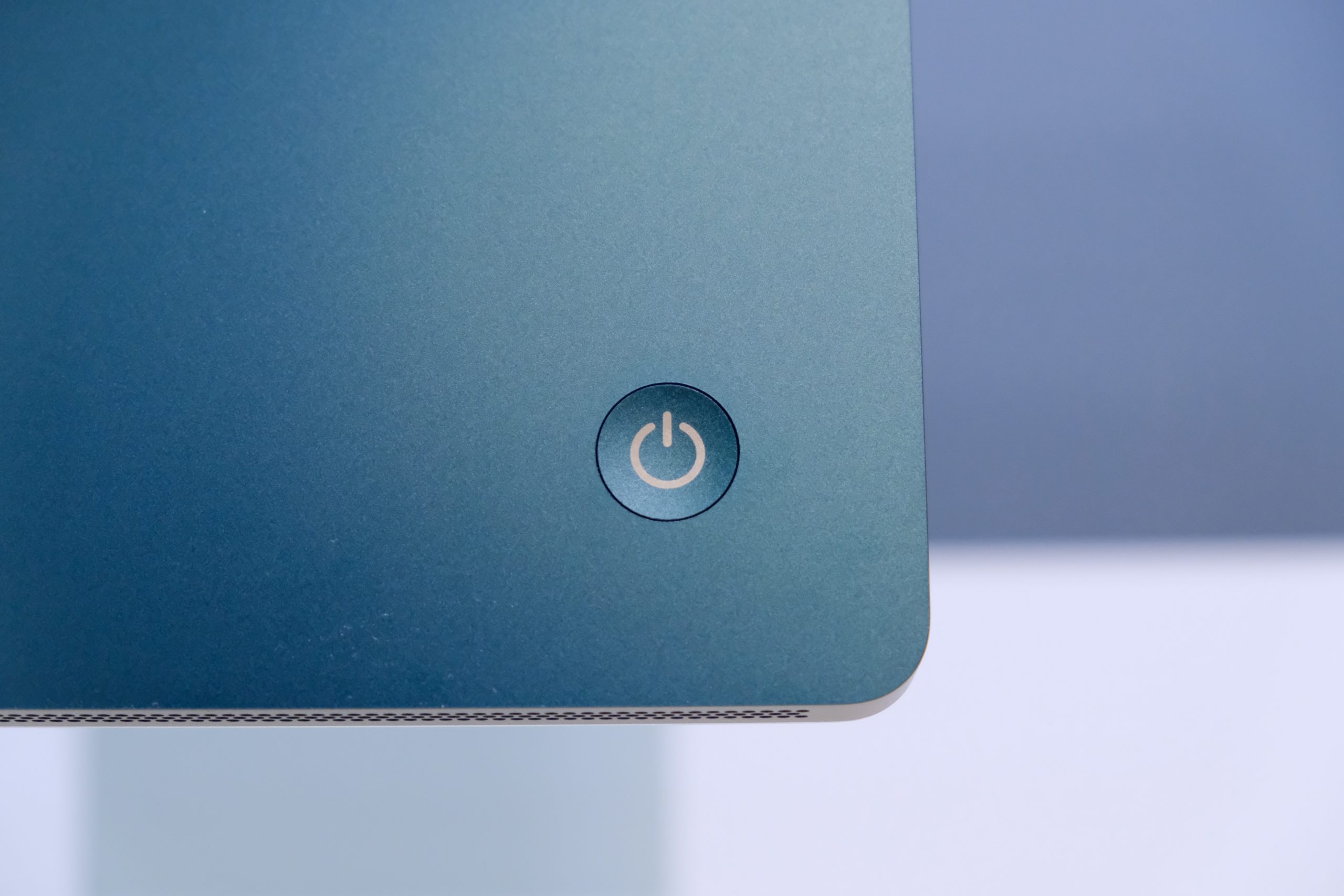 這是 iMac 上唯一一條的電線,iMac 從第一代開始就堅持了這個精神,盡可能地減少個人電腦周邊雜亂的線材,早期滑鼠跟鍵盤還是有線的,而到了現在,滑鼠跟鍵盤、觸控板早就走向無線,因此 iMac 只會需要一條電源線,就能開始使用,這次的設計更是加入了磁吸式的機構,讓使用者不用像以前那樣去把電源線推壓入機背,用磁吸式接頭靠近機背插座,輕輕鬆鬆就完成連線。