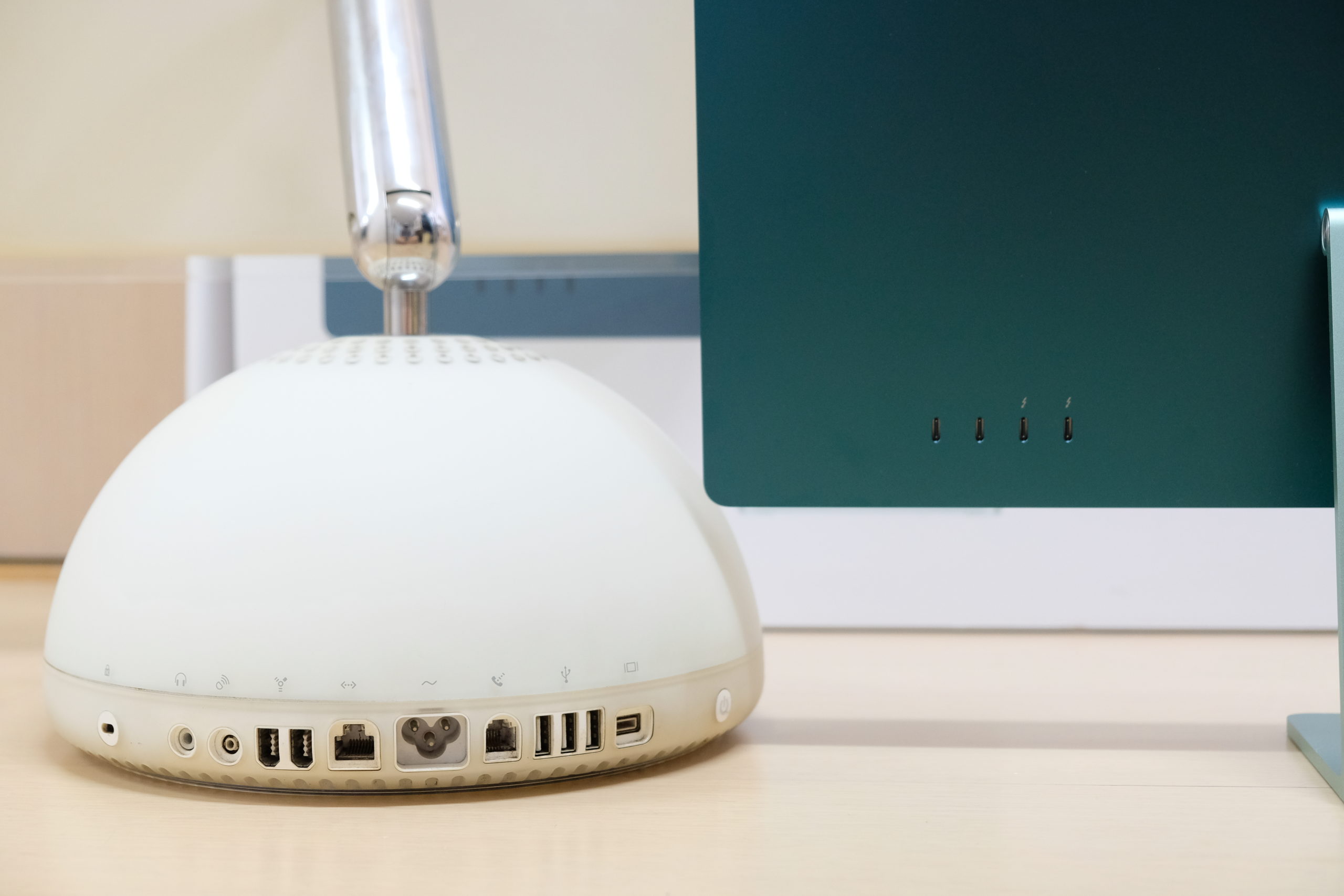 iMac 在維持了數年不變的銀色圓弧機身設計後,終於迎來的大改款。除了晶片從(不爭氣的) intel 改成自家設計的 ARM 架構 M1 晶片之外,搶眼的外型更是讓它在剛推出的時候,就引起蘋果同好圈的大量討論,機身背面我覺得非常漂亮,高飽和度的金屬彩色非常具有設計感,而白色邊框跟寬厚下巴則是這次設計最讓人起爭議的元素,寬厚下巴我沒意見,不過白色邊框我就得拿出信仰來為蘋果辯護,來來來,我這就請出半年前我從垃圾堆撿回來修復的 2002 年 iMac G4,看看這個前衛的檯燈造型,沒有人會說這台電腦不好看吧。要說”經典的 iMac 設計”,我並不會把這個名號頒給上一代的銀色 unibody iMac,檯燈造型 iMac G4 才是我心目中最頂尖的 iMac 造型,它是地球上第一個擁有 flat panel 平面螢幕的一體機,當時可是嚇壞了不少人。