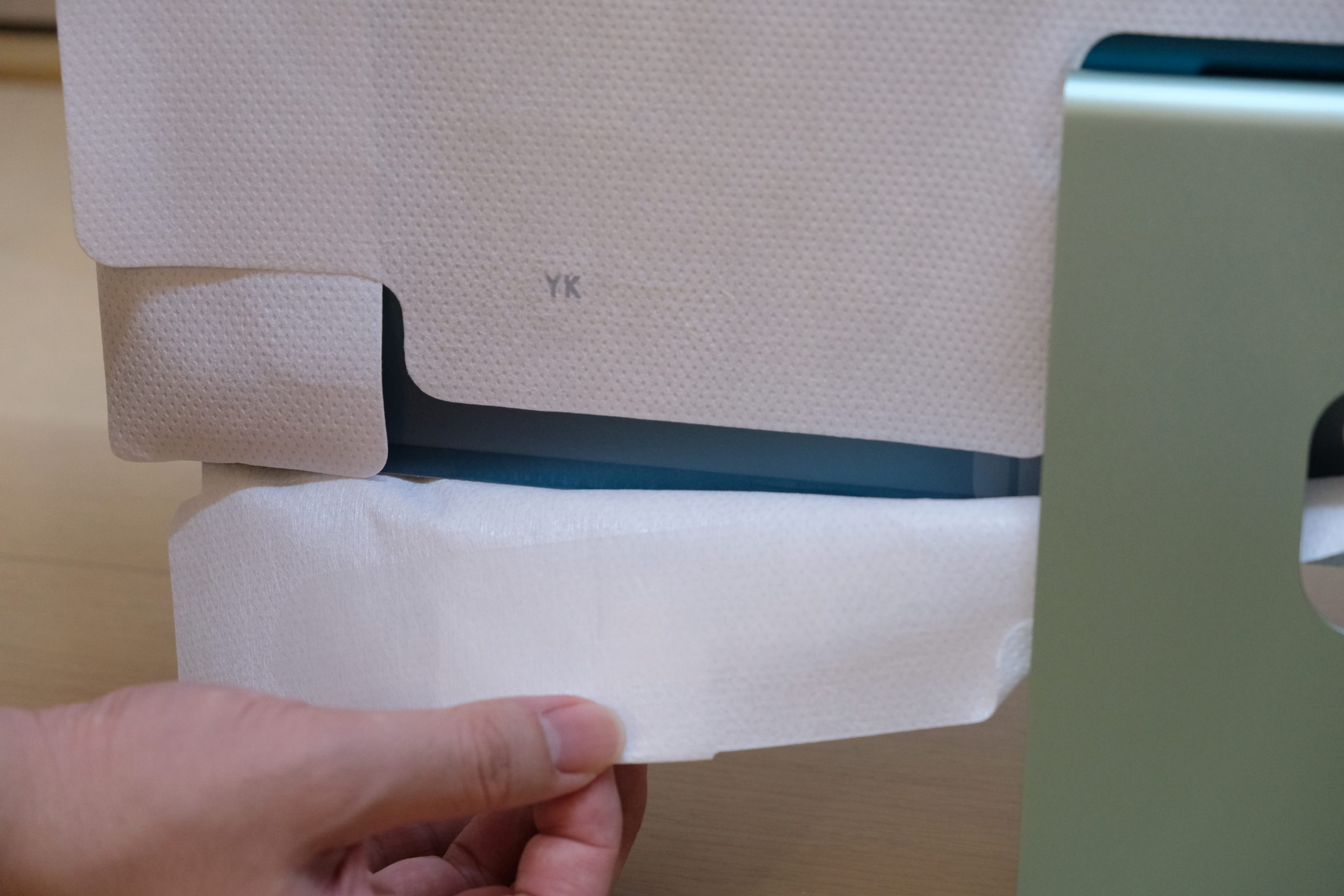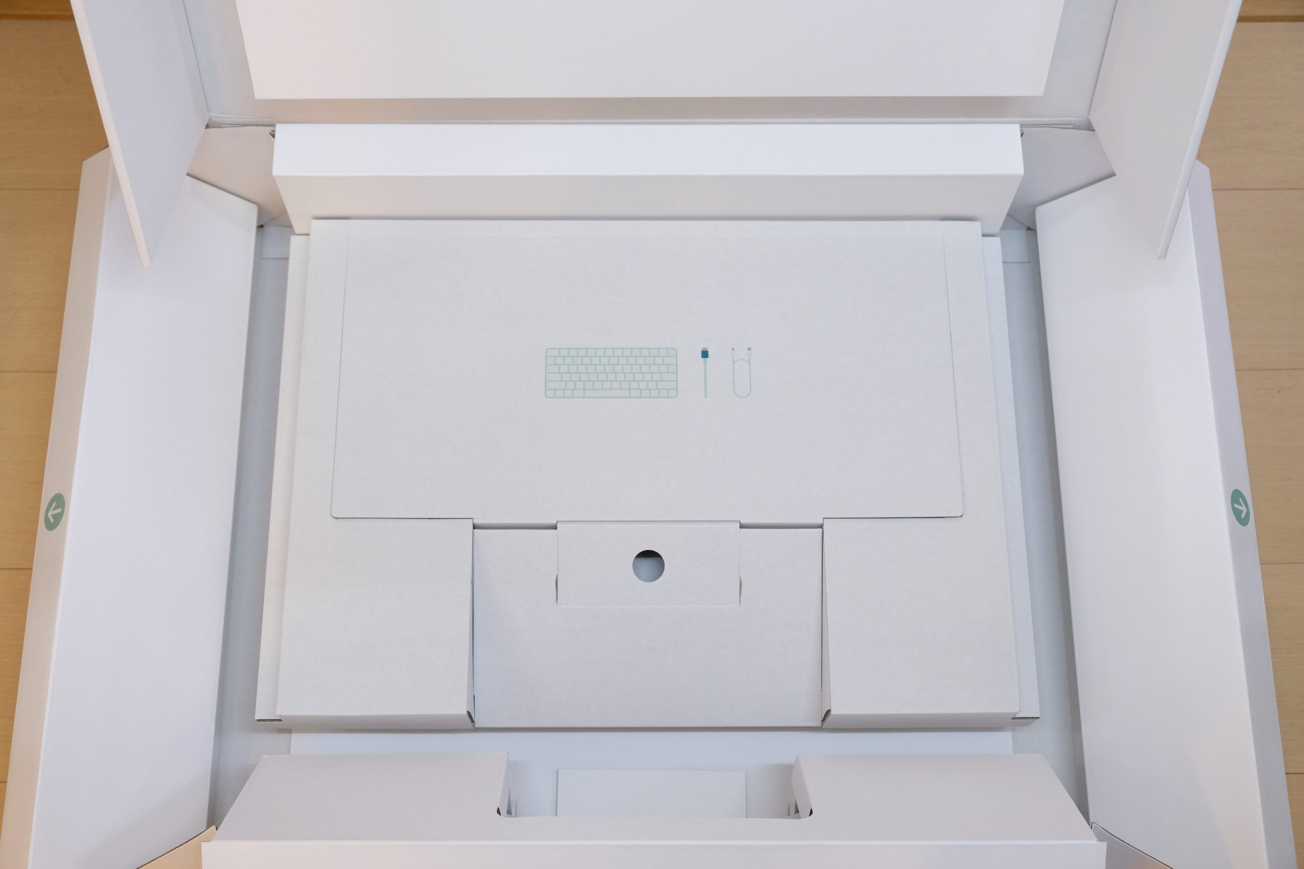 ▼ 三邊的紙板固定結構是連動的,將整台 iMac 展開在眼前,這時候已經可以看到綠色的底座了。