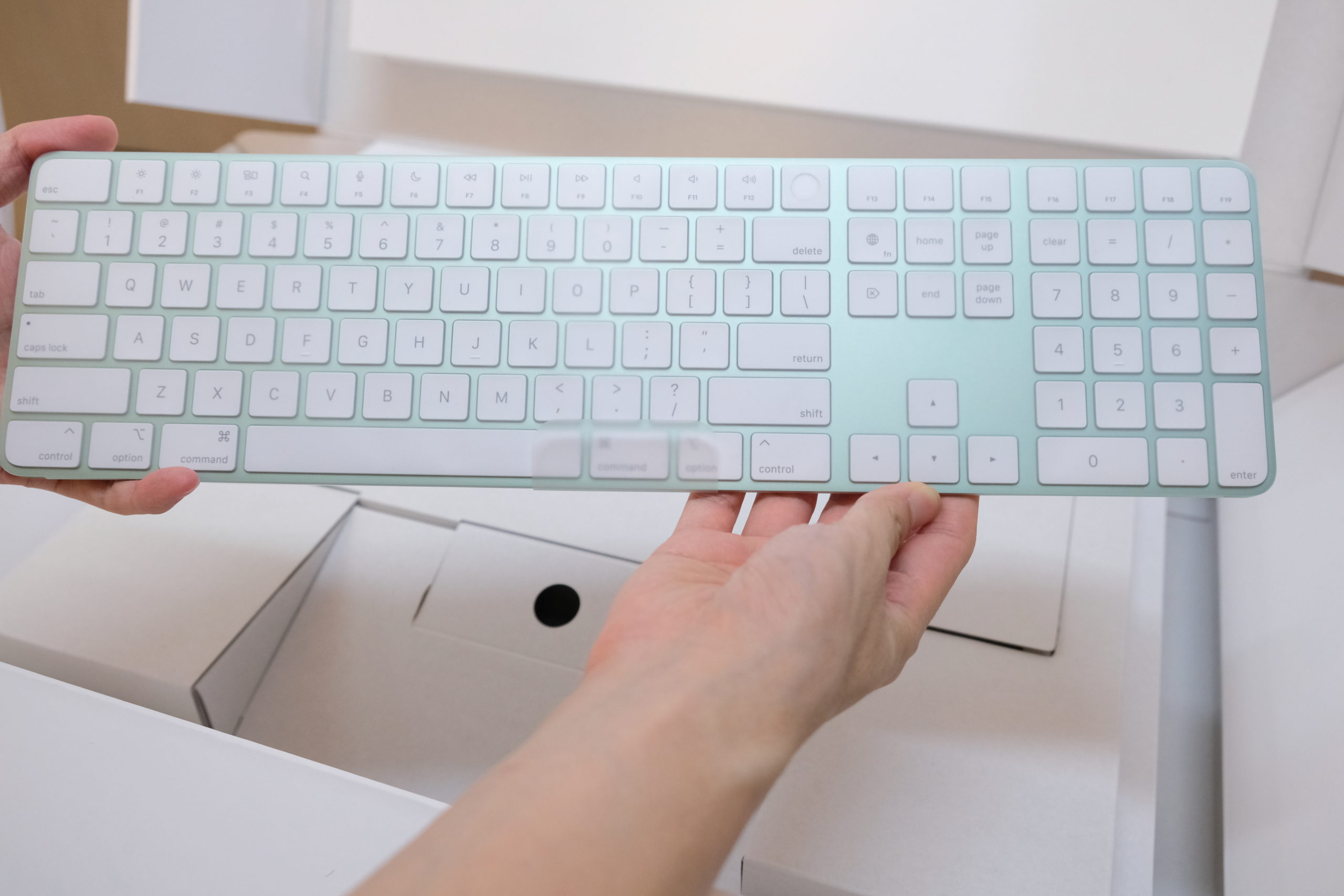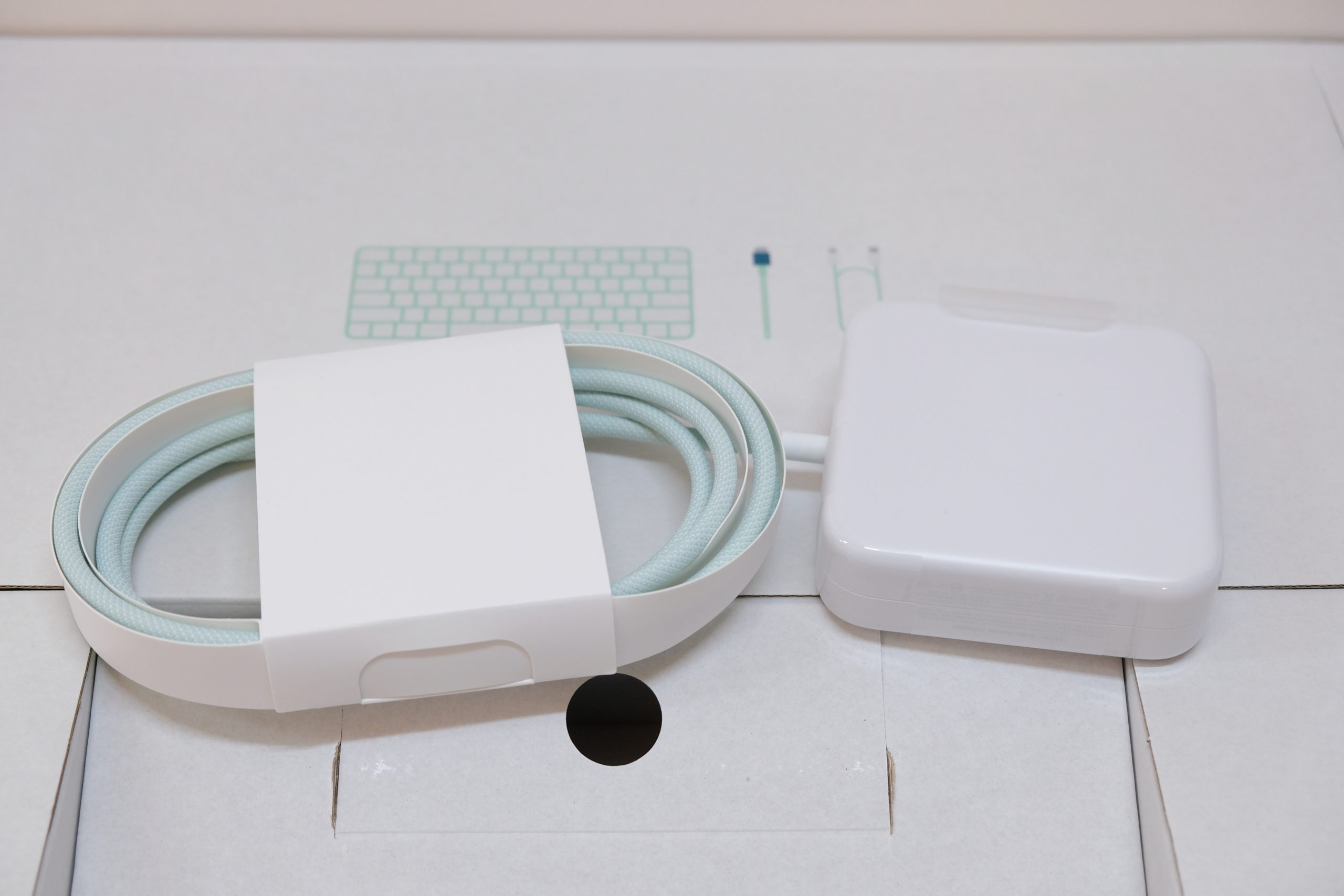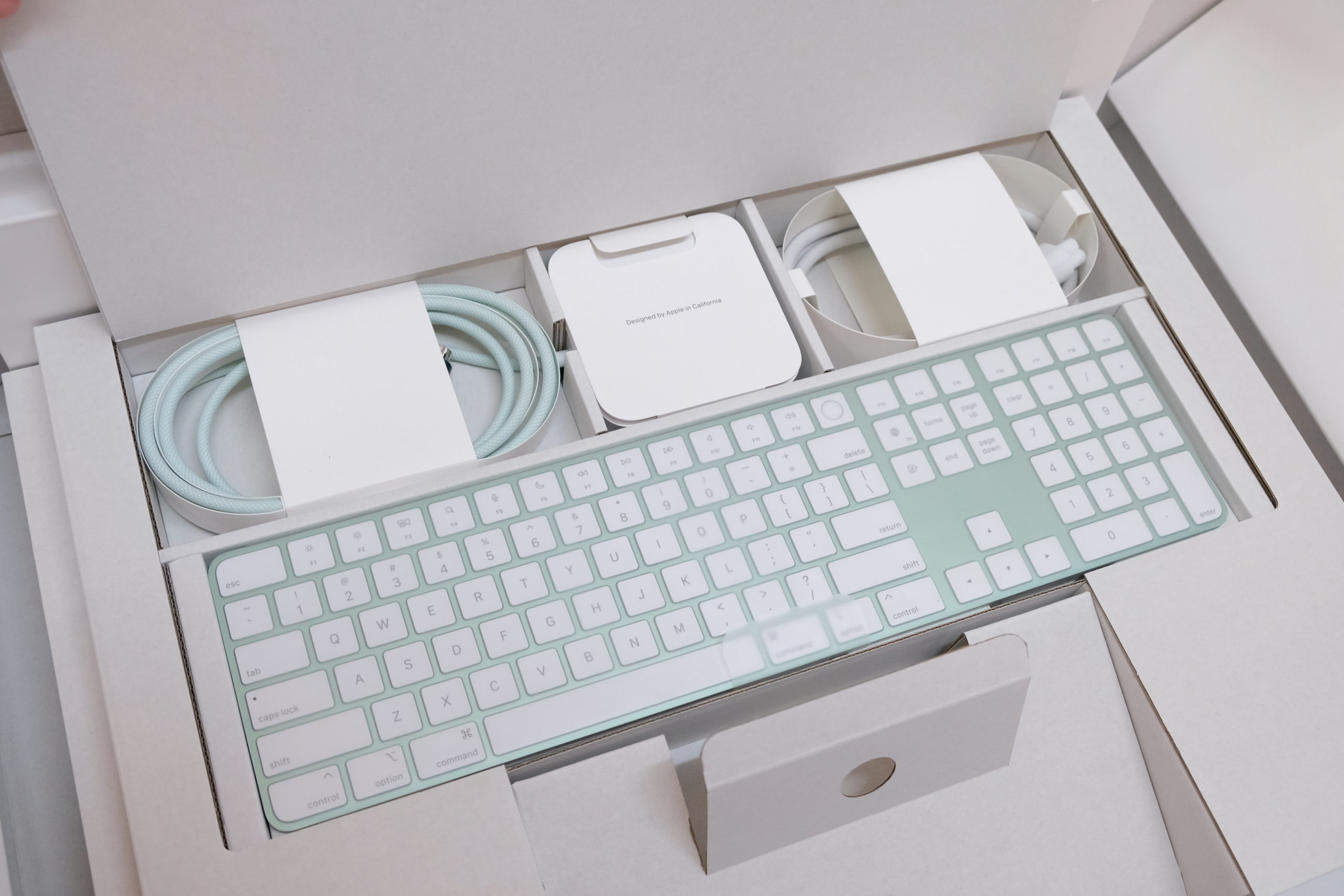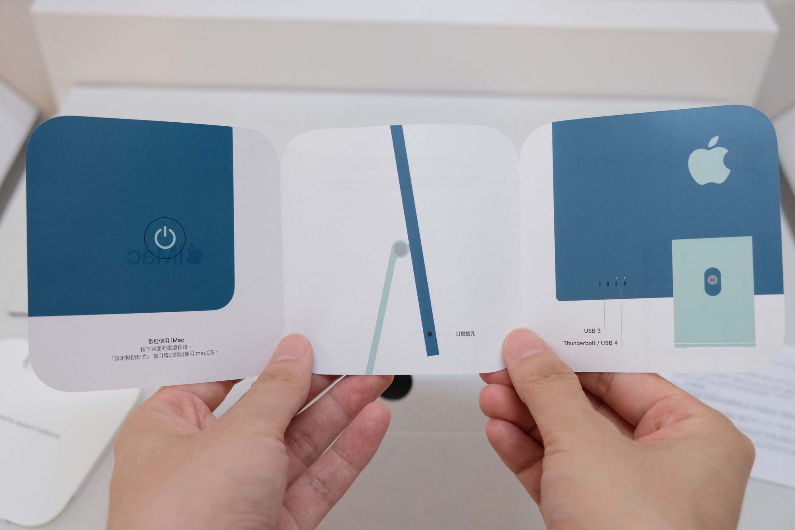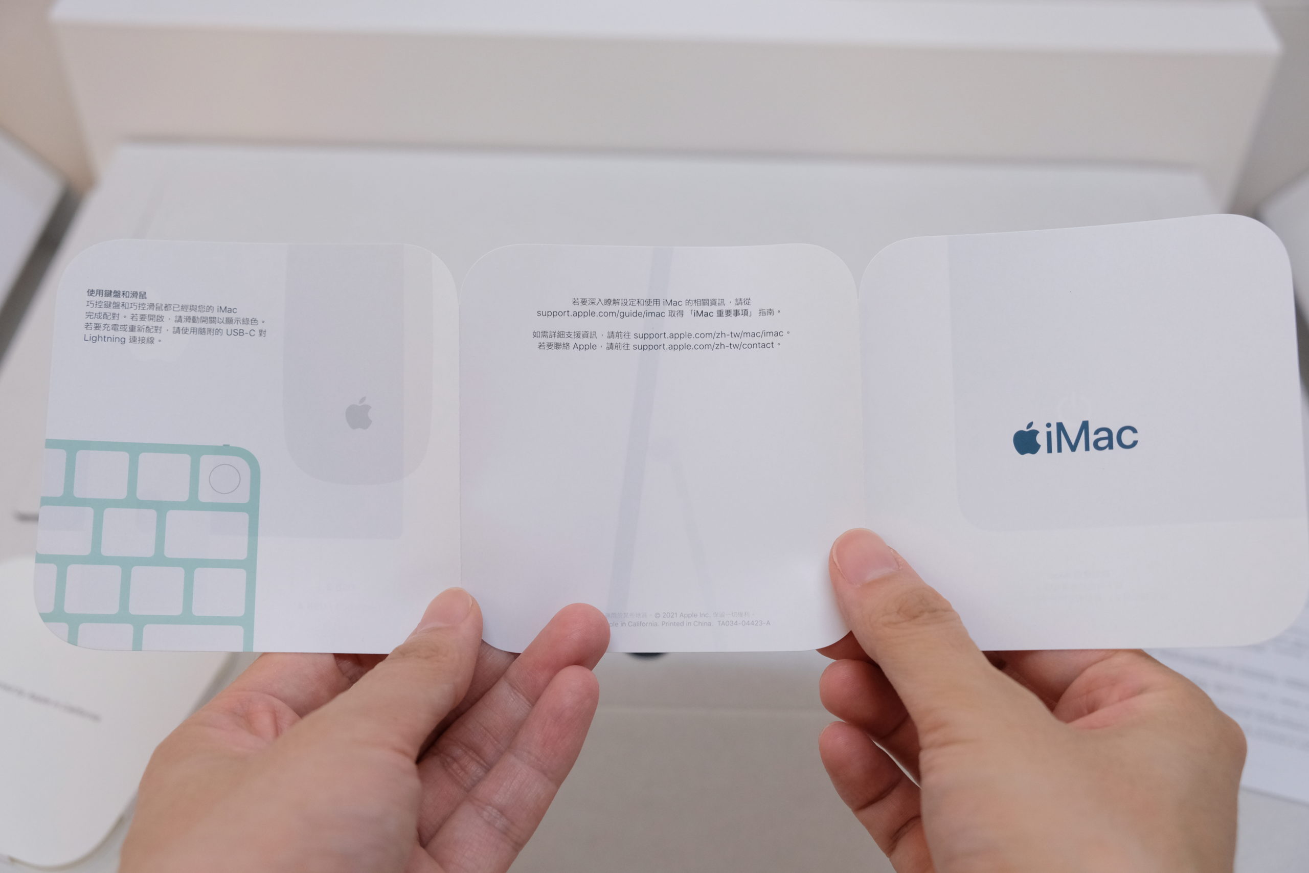 除此之外,這次 M1 iMac 最令人津津樂道的,就是搭配的彩色配件,同色調的電源線、lightning to USB-C充電線、鍵盤、滑鼠、觸控板,連蘋果貼紙都首次出現彩色版本,真的是逼死那些包色收藏家了,尤其是兩條電線,都是採用編織的技術來包裹線材外表,非常賞心悅目。特別要提的,是這次 M1 iMac 的包裝設計非常優秀,完全採用了環保材料,跟去年 27 吋 iMac 與更早的機種那整盒的保麗龍比起來,可以看得出蘋果在全環保包裝材料的承諾中所下足的心血,沒有保麗龍,也一樣能完美地保護盒子裡的內容物,而且整線的技術,配件的位置安排,都非常具有巧思,蘋果在開箱體驗中不斷突破自我,很難不讓粉絲們聲聲讚嘆。