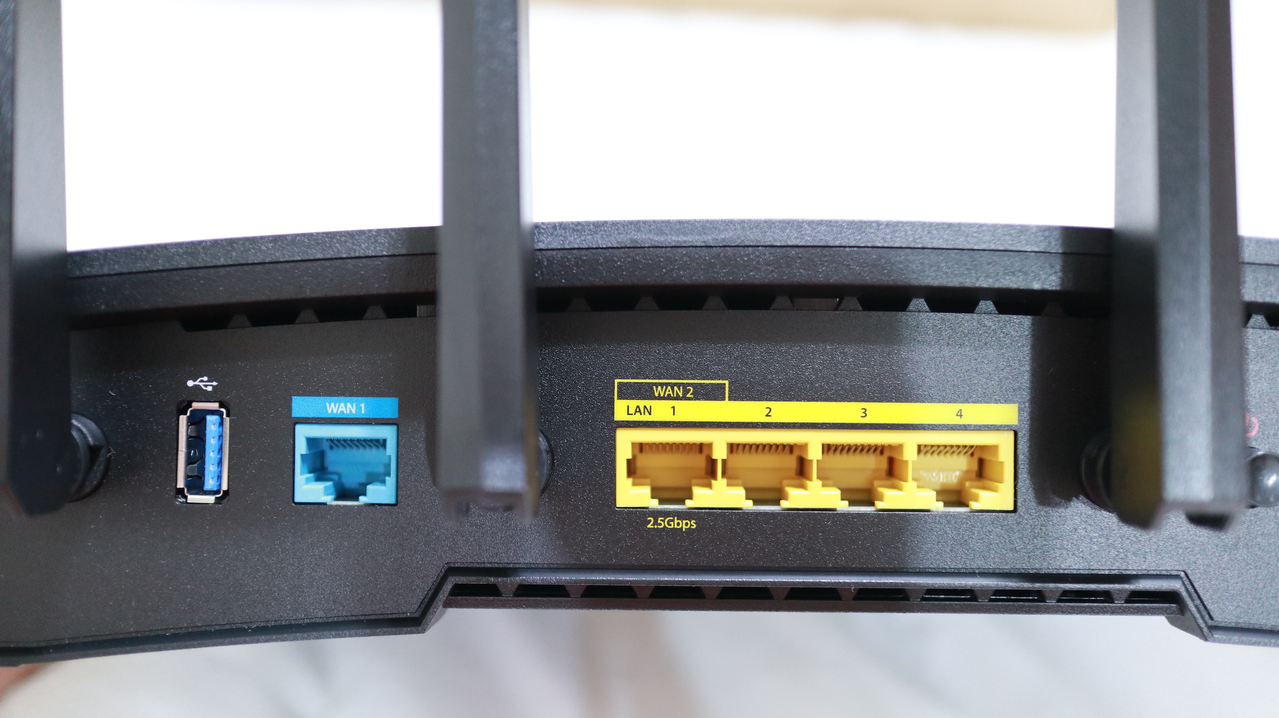 ▼ 背後有這次的大亮點,一方面是 LAN 提供了 2.5Gbps 的速度(只有標示的那個孔有),另外天線也變成了六根。這次的天線不再是旋轉拆卸,這對我很重要,每次我的貓走經過 RT2600ac 就蹭一下,我的天線永遠被他蹭到鬆掉垂下來。現在不但很緊,而且不會因為轉某個方向就鬆掉了。