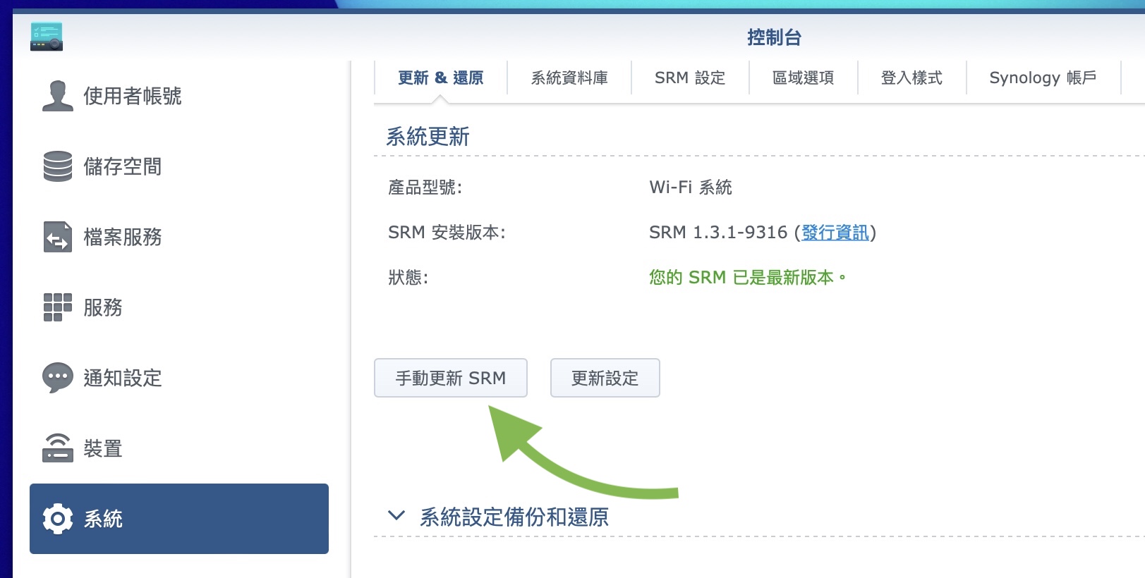 ▼ 讓我們先來更新,先到 RT2600ac 這邊的控制台中的系統,這邊由於 SRM 1.3.1 還是 RC,所以不會在自動更新這邊出現,請到「手動更新 SRM」。