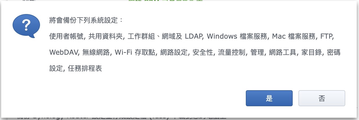▼ 這邊會顯示會備份哪些項目,基本上就是全部。對,就是全部,所以這個備份檔請小心保管,或是用完請刪除,否則如果被別人取得,算是一個資安風險。