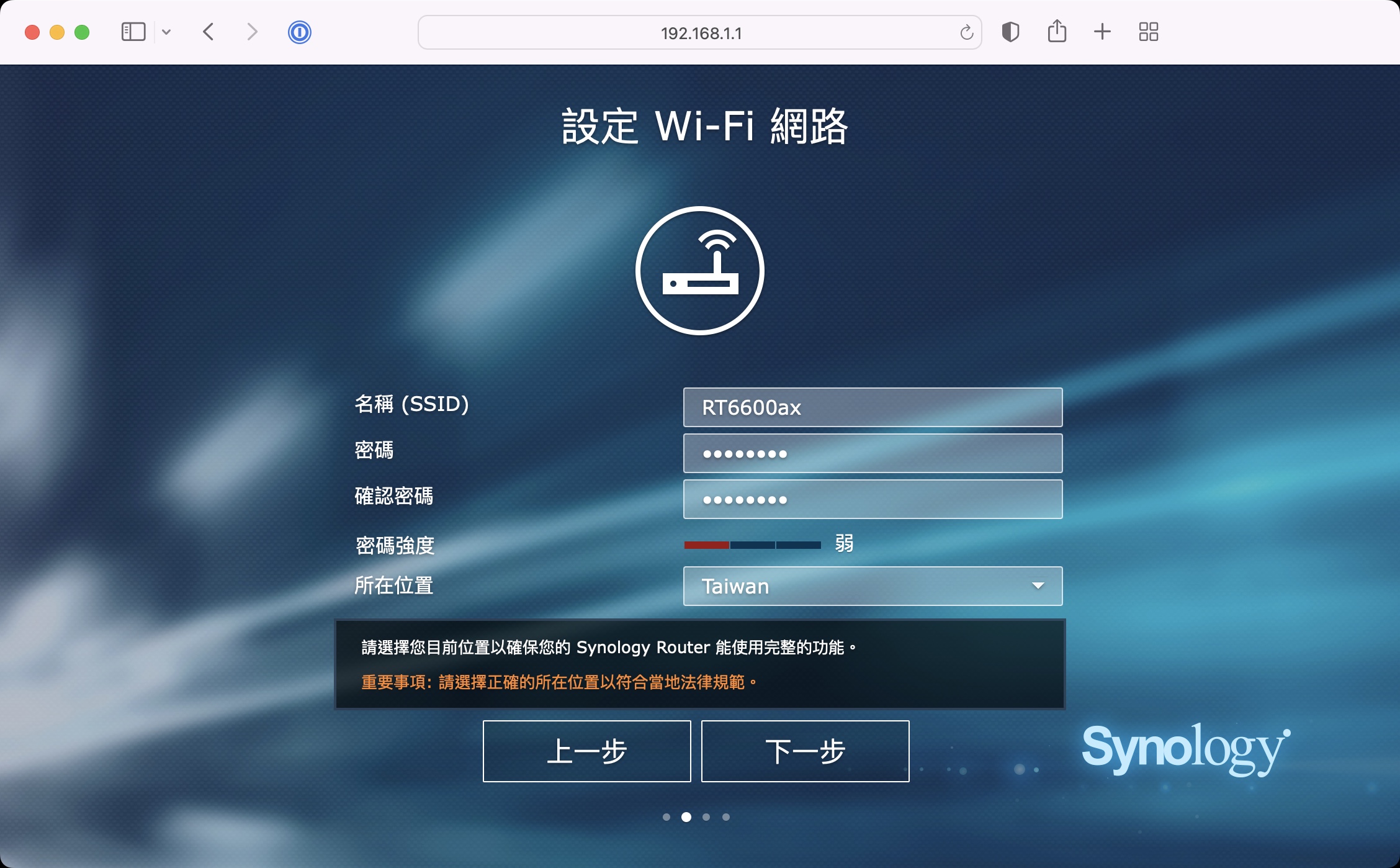 ▼ 接下來我們來新設備這邊設定,首先由於他還是新機器,我們先簡單設定讓他可以進入 SRM 系統主畫面就好,帳密跟 SSID 先設定一組臨時的,建議不要跟以前的一樣,以免等等訊號衝突或是帳號衝突,就取一個臨時一次性的。