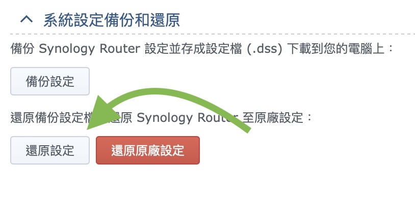 ▼ 更新完成之後,我們到 RT6600ax 的控制台,這次我們選擇「還原設定」,並選擇剛剛下載的備份 .dss 檔案。