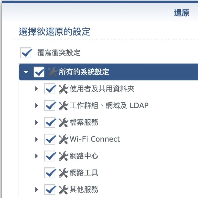▼ 當然,備份檔本身不見得是只能 0 或 1 這樣沒彈性。你中間可以選擇要還原哪些資料,所以我就選了全部,並選擇「覆寫衝突設定」。