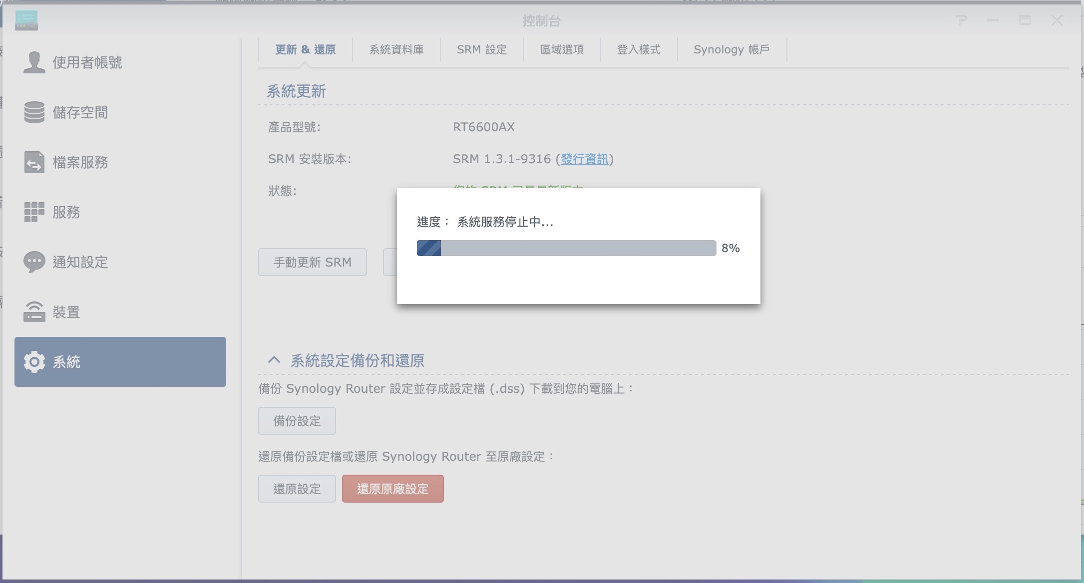 - 開機並更新 RT6600ax 到 SRM 1.3.1 版以上的最新版本(需跟來源 Router 相同版本)