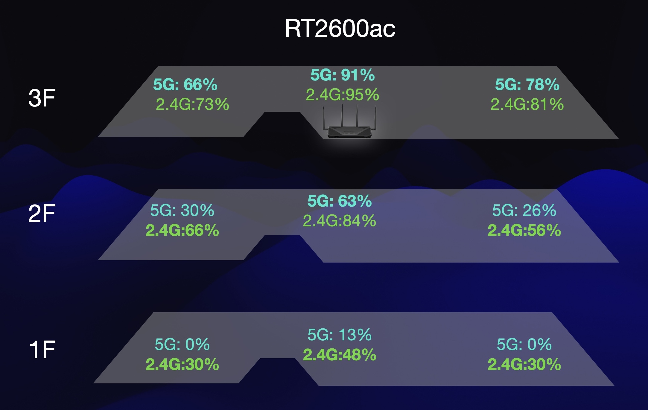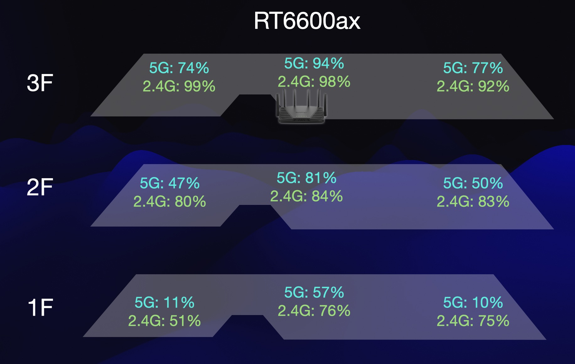 整體來說 RT6600ax 在穿越樓層的表現的確是比 RT2600ac 好一些,不過如果你單純是為了延長收訊範圍,與其把 RT2600ac 更換成 RT6600ax,我建議不如把預算拿去買1-2台 MR2200ac 做 Mesh 效果會好非常非常多。(請點此看這篇介紹 Mesh 訊號升級差異)