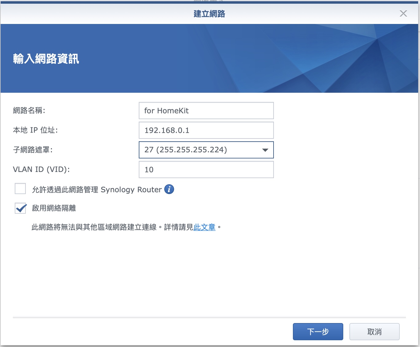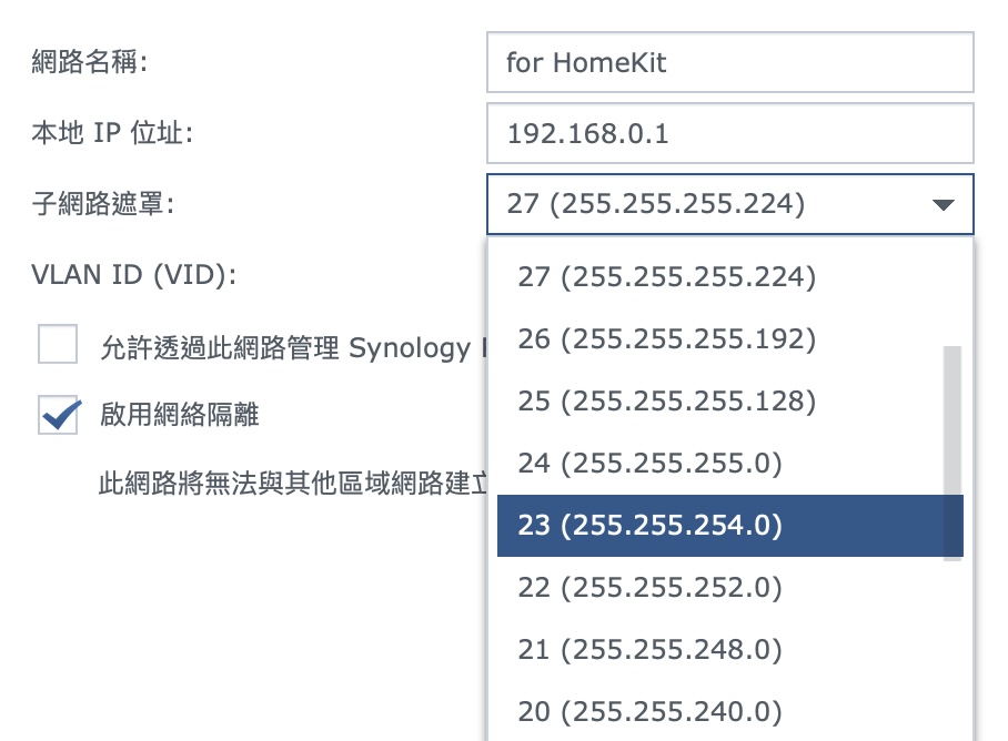 ▼ 家用還有另一種應用情境,IoT 設備。這些 IoT 設備只要網路能通就好,我完全不想讓他們碰到我家中的其他網路設備,以免任何的風險,像這樣,我就會另外切一個 VLAN 給他們,記得勾選「網路隔離。」
