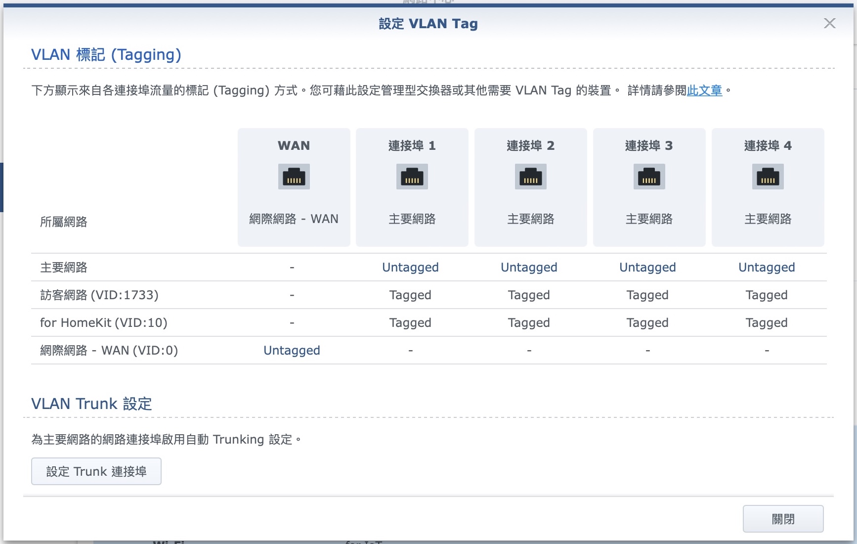不過,我之所以會說這台著眼點開始瞄準企業市場,不只是 VLAN 功能,他還有 Trunk 功能。Trunk 在家用市場真的是很少會用到,可以說是幾乎沒人家用會用這個功能。因為大多人的家中,可能會有 Mesh 擴大範圍,但不太可能出現好幾台 Router 跟 Switch 去對應不同的房間吧。但企業就會。