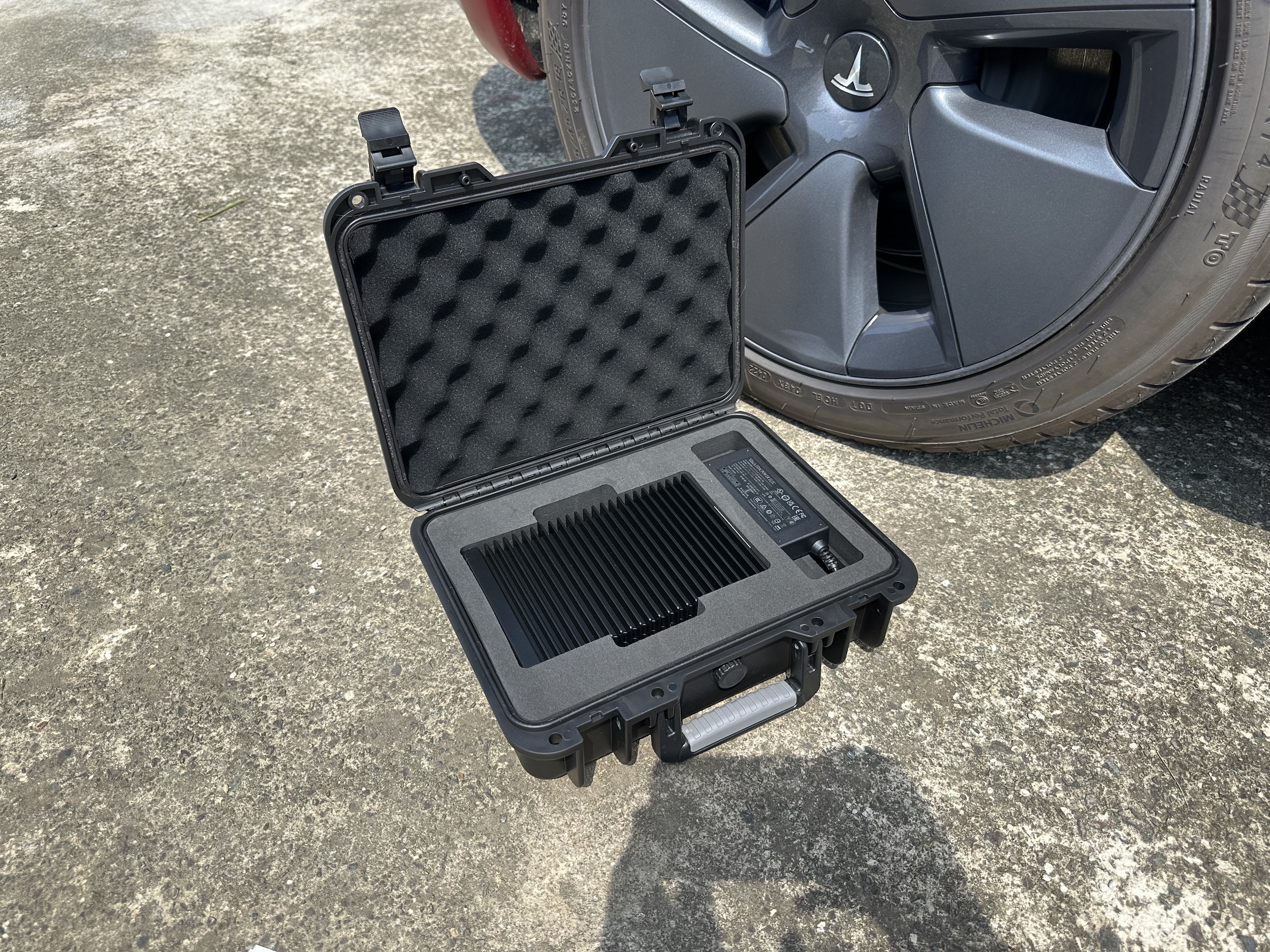 話說他的體積真的是不小,讓我們打開來看看,並以特斯拉 18吋輪圈作為比例尺(這樣有起到戶外使用的示意效果嗎?)真的是又大又重,但是這種專業取向的設備,重量不算是很大的扣分點,穩定性跟耐用才是最重要的。