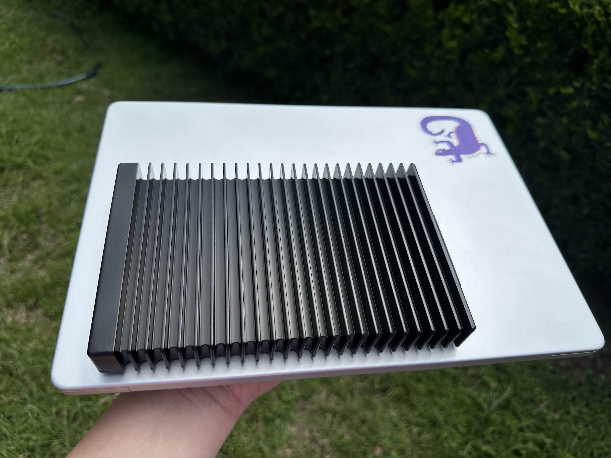 本質上來說,其實裡面就是內建 4 條 NVMe M.2 SSD,這個發熱量非常驚人,所以這次的體積其實有很大一部分是做在散熱鰭版上。畢竟如果發熱沒做好,熱量一上來是直接影響 SSD 的跑速。