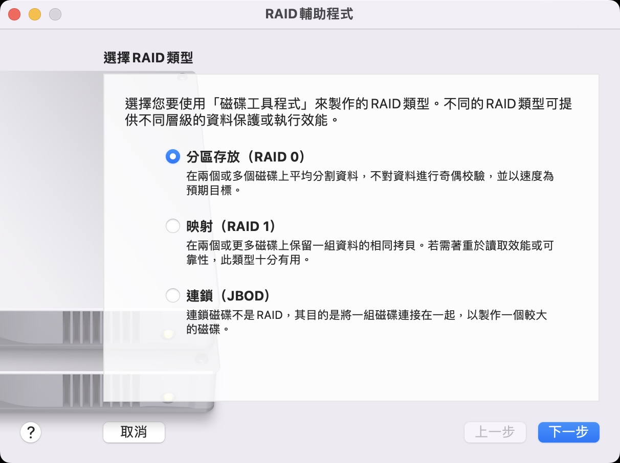 我使用的是內建的 RAID 輔助程式。不過這就只能做成 RAID 0 或是 RAID 1,如果你有 RAID 5 的需求,你還是需要 SoftRAID,這方面就是他的優勢了。