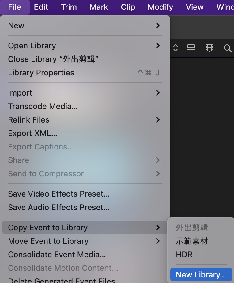 正確的作法應該透過 FCP 的指令來搬移資料。接上外接硬碟之後,選擇想要移到外接硬碟的事件,再點選選單列的 File 選擇 Copy Event to Library 或是 Move Event to Library。兩者的差別在於 Copy 會留下原本的事件,Move 的話原本的會刪除,只剩下移動過去的那一份。