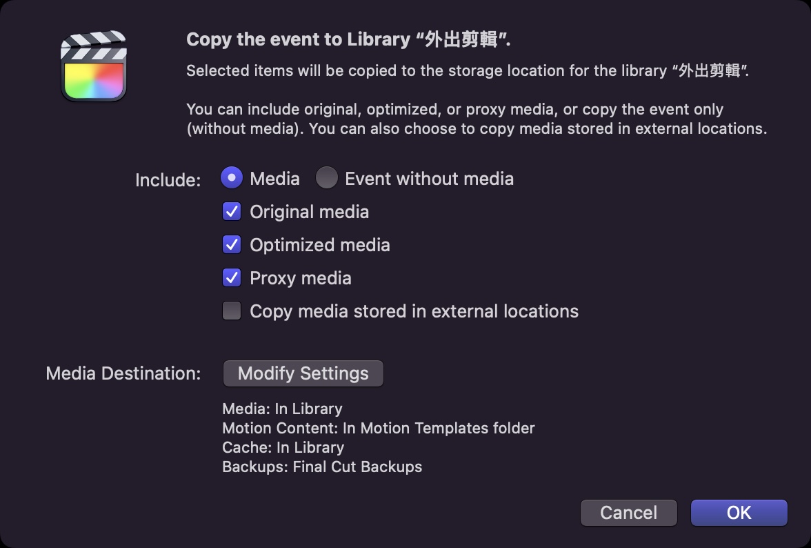 此時會跳出視窗詢問,轉檔過的 Optimized 與 Proxy 檔案要不要一起搬移到這個 Library,都不勾選的話就只會把原始的影片檔複製過去,不過之後也可以再次製作的,不用擔心。