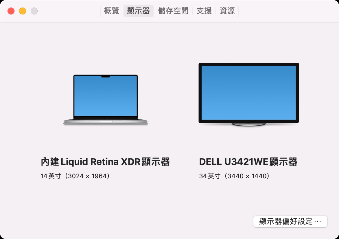 我的外接螢幕是 Dell U3421WE,他就是一個 21:9 的 2K 螢幕,解析度 3440 x 1440 雖然在 Mac 顯示圖看不出來他是 21:9,不過我貼一張 Dell 官網的圖就很明顯了。