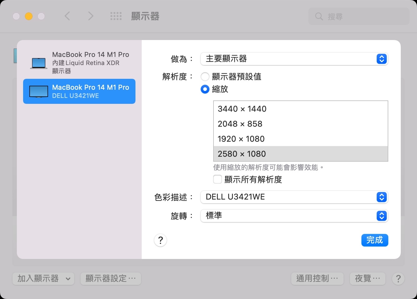 設定完,重新開機之後,我們回來顯示器的偏好設定,已經看到 2580 x 1080 的後面已經多了 (HiDPI)