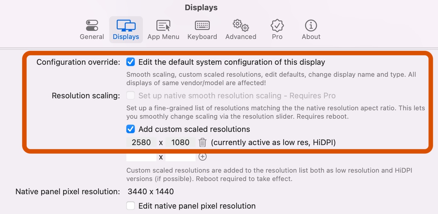 我們在 Displays 這邊可以找到這兩個選項,我們勾選這兩個,就可以把這個解析度設定直接寫入到系統裡面。是的,你再也不需要每次開機都要執行這個軟體,甚至你可以把它刪除也沒有影響。