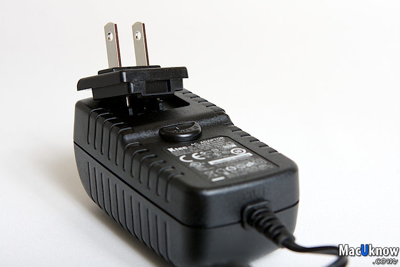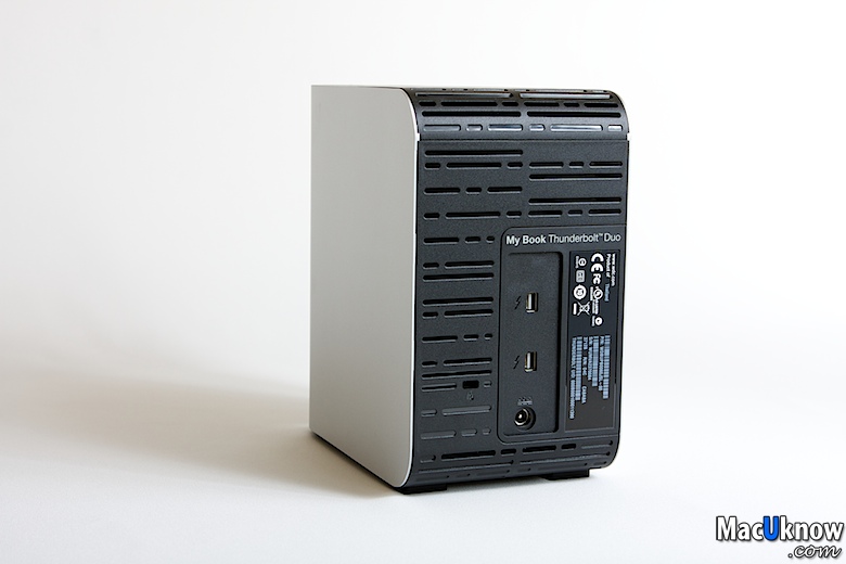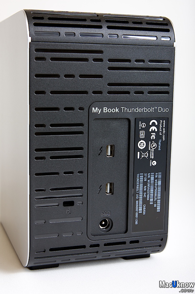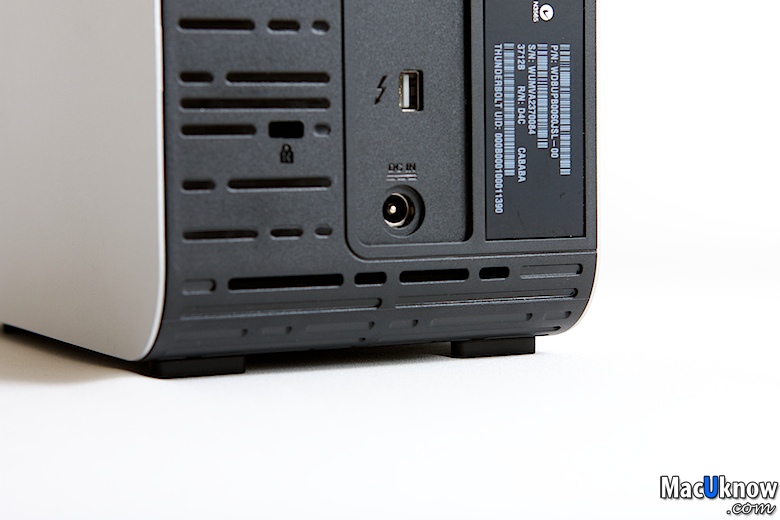 近看一下背面,提供兩個Thunderbolt傳輸介面孔,讓你可以串接更多的Thunderbolt介面裝置,例如另外一個My Book Thunderbolt Duo,或者Apple的27吋Thunderbolt螢幕。